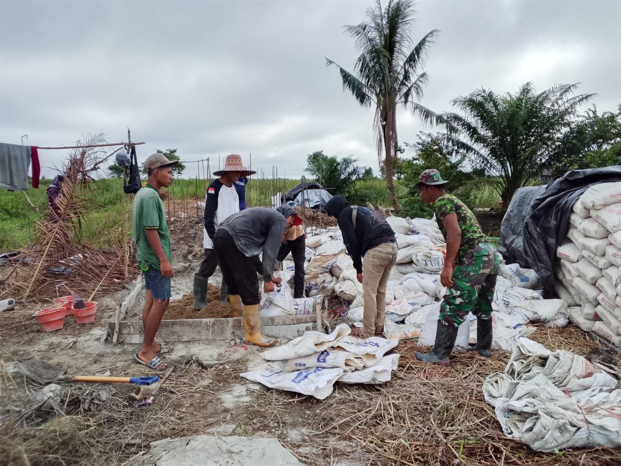 Di tengah kondisi medan yang berair dan berlumpur, semangat warga tetap tinggi. Mereka bahu-membahu mengerjakan setiap tahapan pembangunan dengan penuh ketelitian, khususnya pada pemasangan tulang besi dan proses pengecoran pondasi yang memerlukan presisi tinggi.