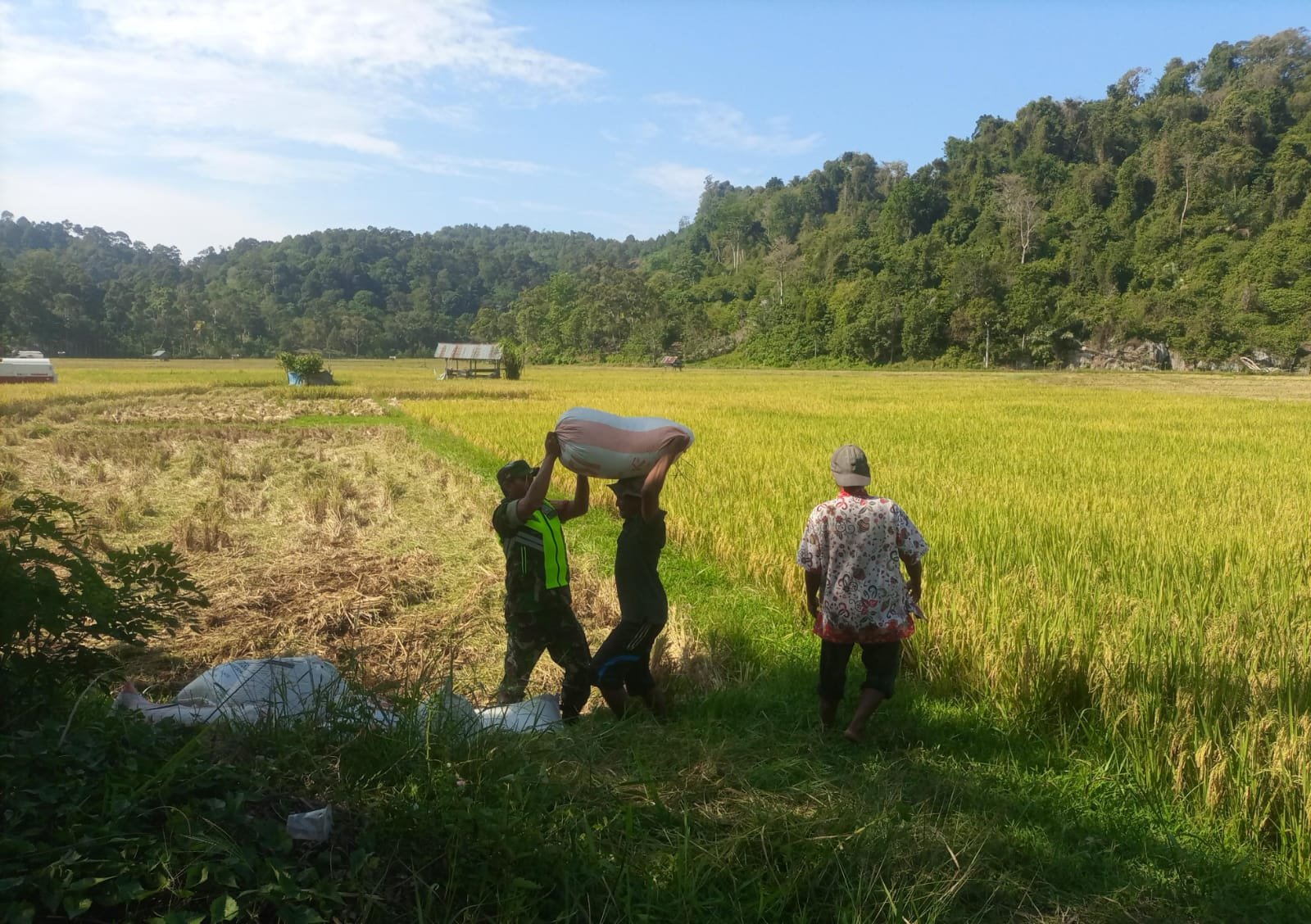 Babinsa Koramil 01/Jaya Bantu Petani Angkat Padi Hasil Panen di Desa Lhuet