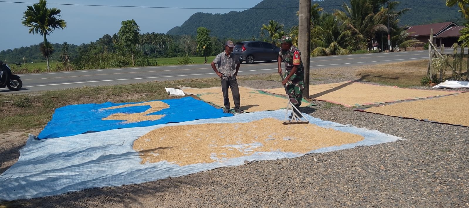 Kegiatan tersebut dilakukan dengan membantu Pak Sulaiman (45), seorang warga setempat, menjemur padi hasil panen yang nantinya akan digiling menjadi beras untuk kebutuhan konsumsi sehari-hari. Kehadiran Babinsa di tengah masyarakat diharapkan dapat memberikan semangat serta meringankan beban warga dalam menjalankan aktivitas pertanian.