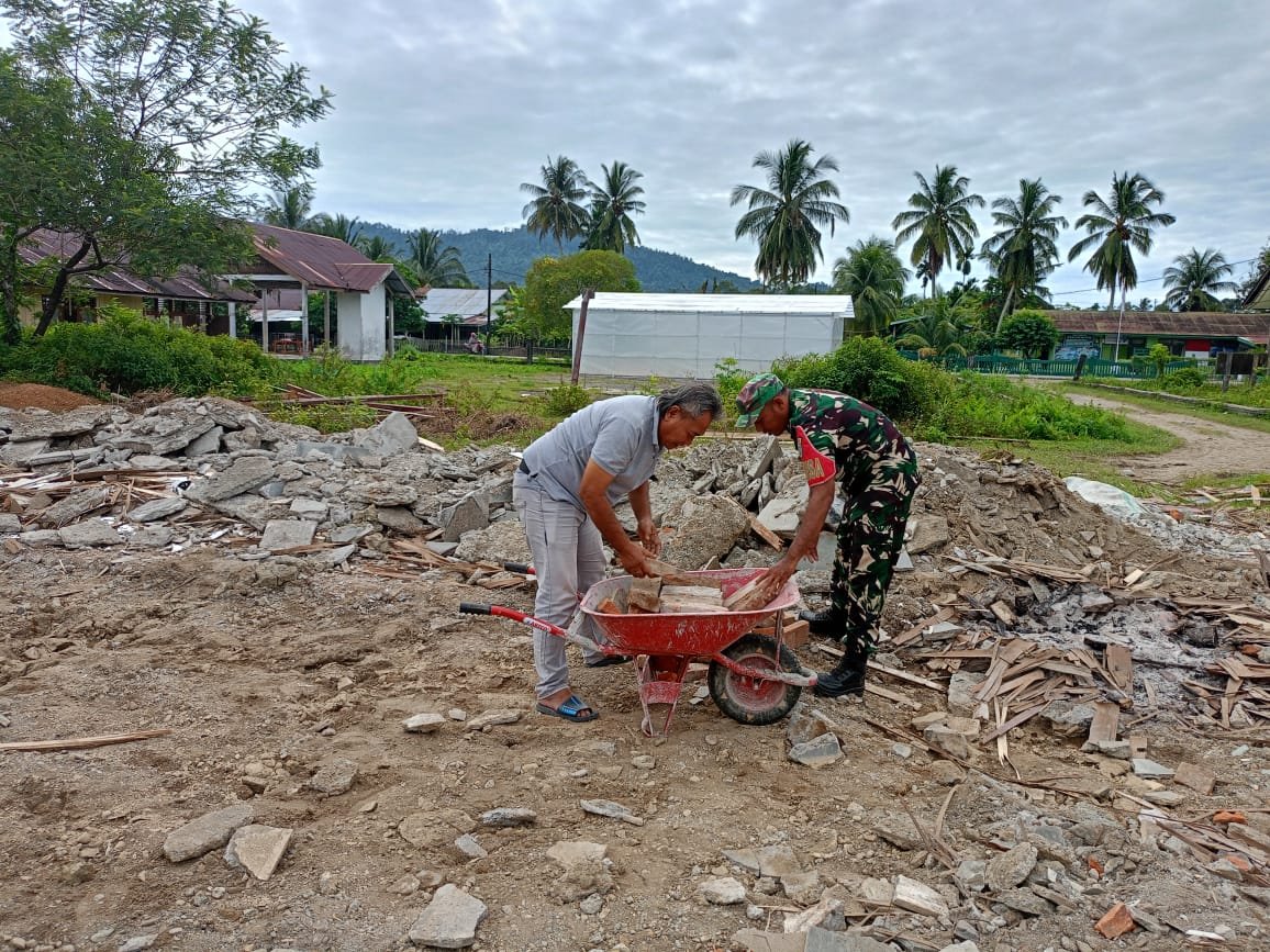 ACEH JAYA – Babinsa Koramil 01/Jaya Kodim 0114/Aceh, Koptu Dedi Januari, menunjukkan kepedulian terhadap warga binaan dengan membantu Bapak Nadirun mengangkat batu bekas bangunan sekolah yang telah dibongkar. Batu-batu tersebut digunakan untuk menimbun bagian samping rumah yang kerap tergenang air saat hujan, di Desa Meunasah Weh, Kecamatan Jaya, Kabupaten Aceh Jaya, Rabu (31/12/2025).