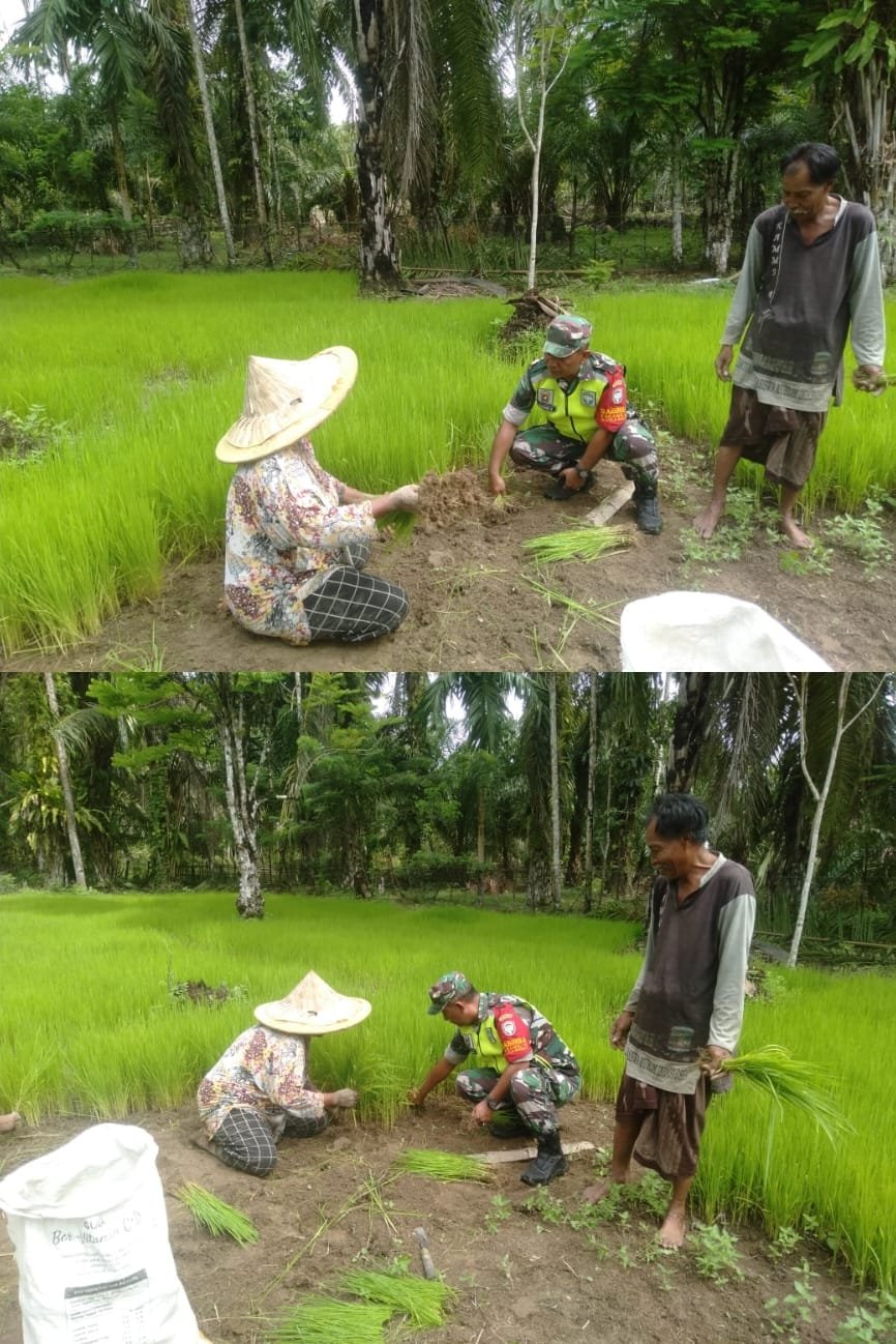 ‎Babinsa Koramil 0105-10/Woyla Barat Bantu Warga Cabut Bibit Padi di Desa Ulee Pasi Ara