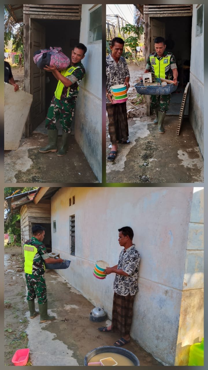 ACEH BARAT — Babinsa Koramil 02/Woyla Kodim 0105/Aceh Barat, Sertu Suryanto Antoni, hadir di tengah masyarakat Desa Pasi Pandan, Kecamatan Woyla, untuk membantu warga mengevakuasi barang-barang yang terdampak sisa banjir, Rabu (03/12/2025).