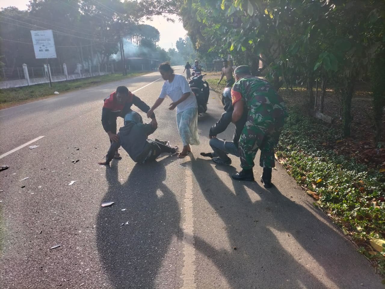 Babinsa bersama warga sekitar dengan sigap mengevakuasi korban ke tempat aman serta membantu mengatur arus lalu lintas agar tidak terjadi kemacetan maupun kecelakaan susulan. Korban kemudian dibawa ke Puskesmas Panga untuk mendapatkan penanganan medis lebih lanjut.