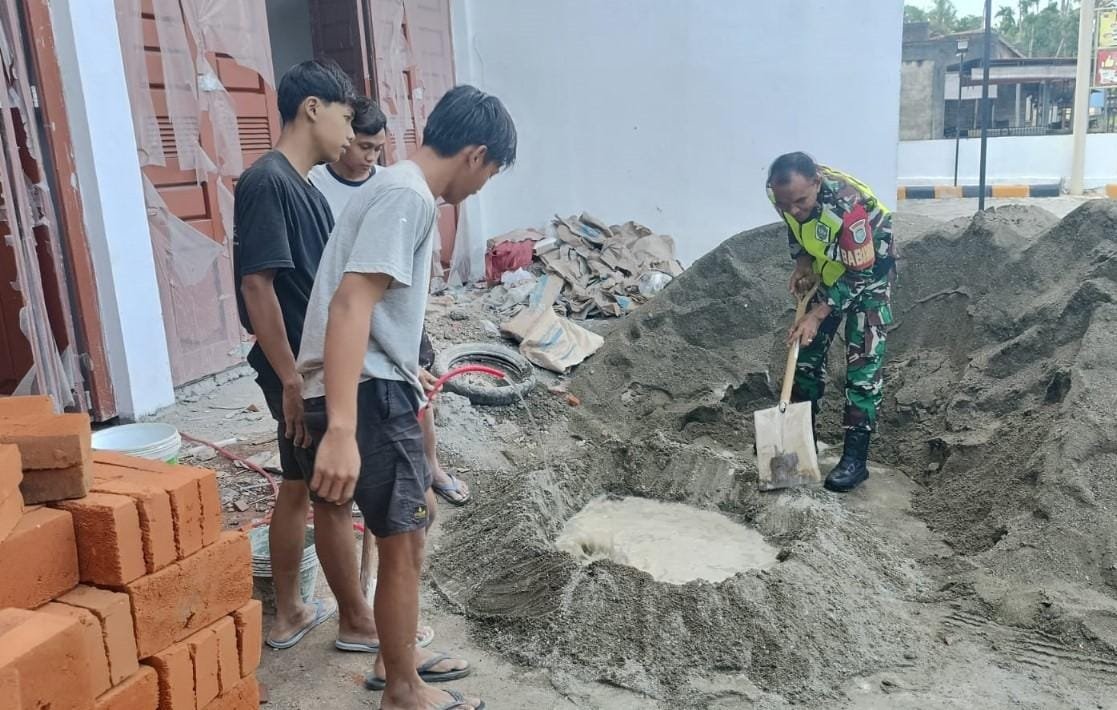 ACEH BARAT – Babinsa Koramil 08/Arongan Lambalek Kodim 0105/Abar, Serma Sucahyono, melaksanakan kegiatan gotong royong membantu warga dalam proses pembangunan ruko di Desa Teupin Peuraho, Kecamatan Arongan Lambalek, Kabupaten Aceh Barat, Sabtu (22/11/2025).