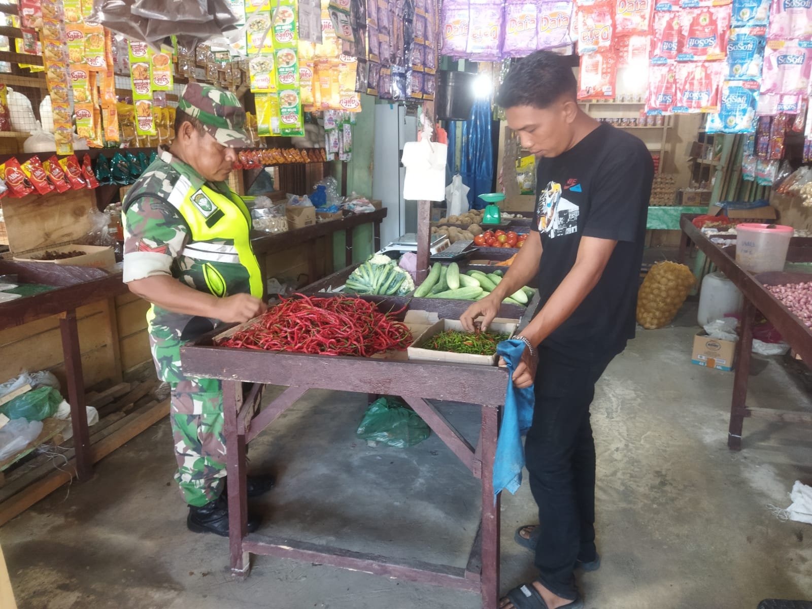 ACE JAYA – Dalam rangka memantau perkembangan harga kebutuhan pokok di wilayah binaan, Babinsa melaksanakan pengecekan pasar di Kecamatan Teunom, Kabupaten Aceh Jaya, Minggu (21/9/2025). Kegiatan ini bertujuan untuk mengetahui stabilitas harga sembako sekaligus memastikan ketersediaan bahan pokok bagi masyarakat.