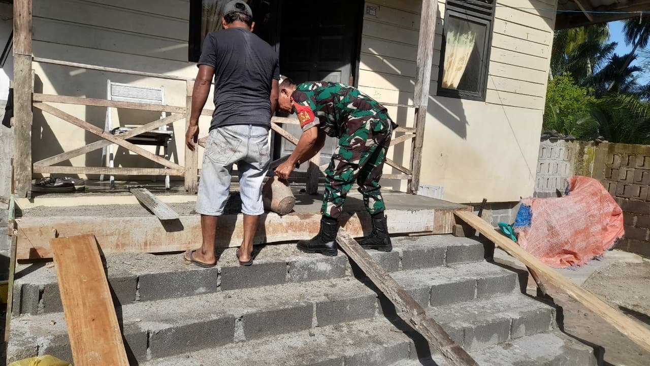 Babinsa Teunom Bantu Warga Bangun Tangga Rumah di Desa Rambong Payong