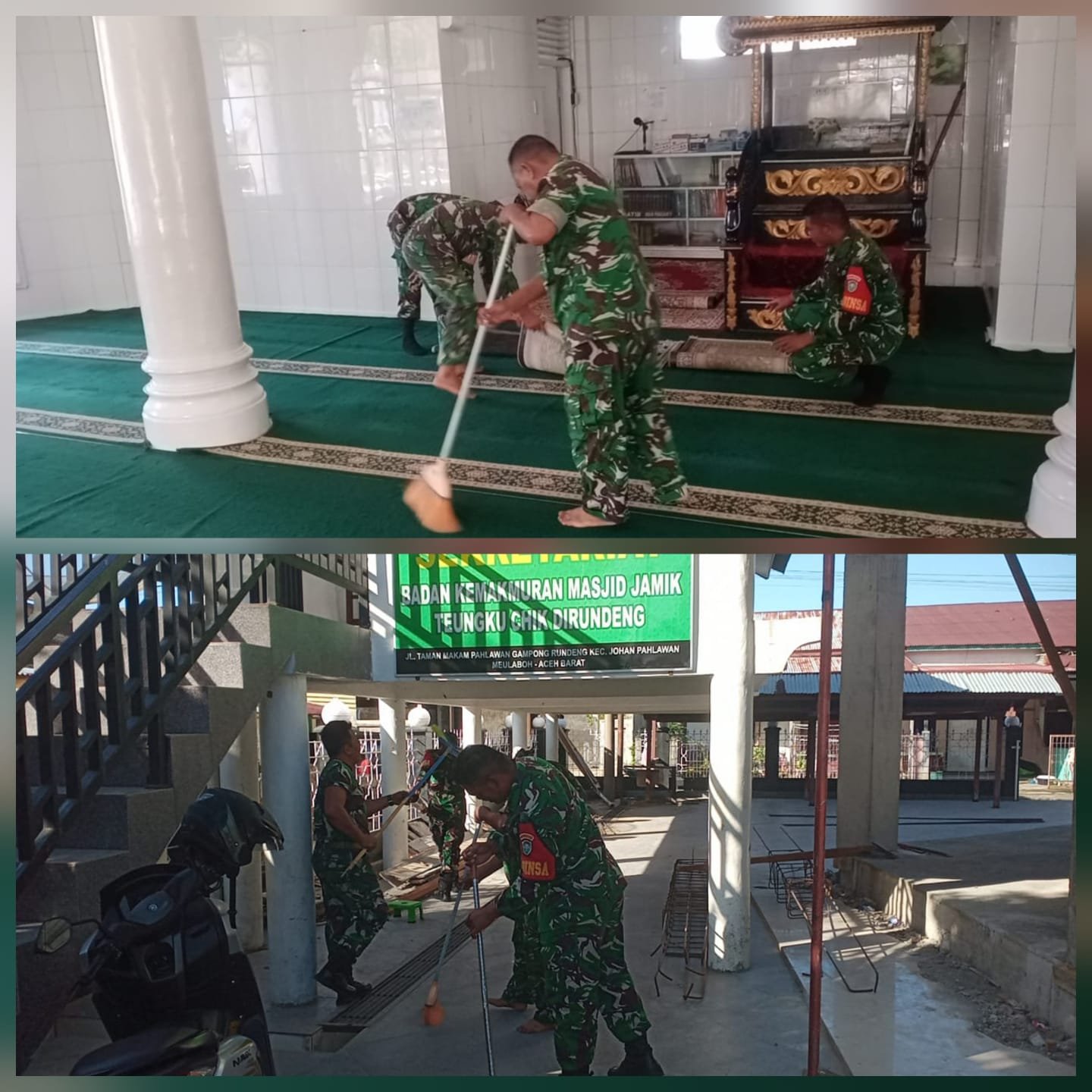 Batuud Koramil 07/Johan Pahlawan Pimpin Anggotanya Melakukan Pembersihan Masjid Jamik Tgk Chik di Rundeng