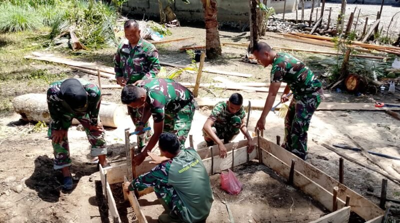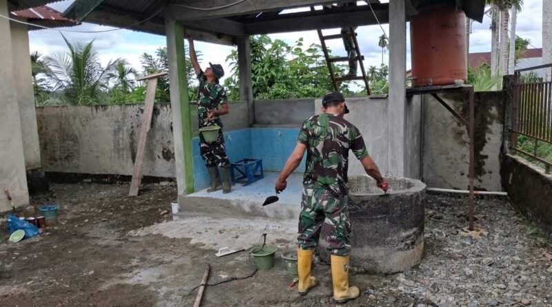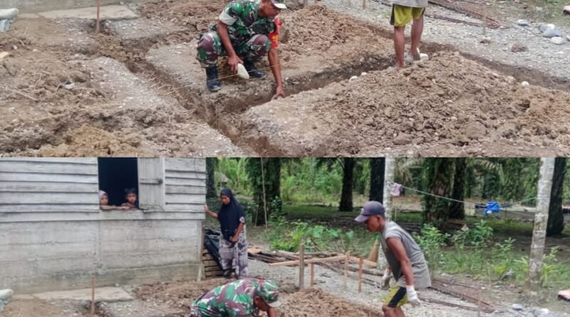 ACEH JAYA – Babinsa Koramil 03/Setia Bakti jajaran Kodim 0114/Aceh Jaya, Serda Zainal Aripin, bersama masyarakat melaksanakan penimbunan