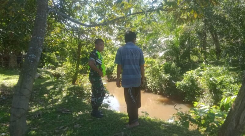 ACEH BARAT — Babinsa Koramil 11/WT Serka Ongku bersama warga melakukan pengecekan kondisi aliran sungai di Desa Aleu