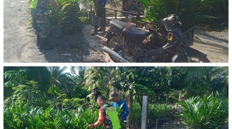 ACEH BARAT – Sertu Pendi, Babinsa Posramil 06/Bubon Kodim 0105/Aceh Barat, melaksanakan kegiatan perawatan pembibitan pohon kelapa sawit
