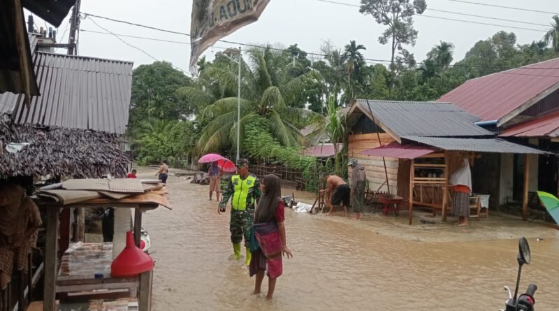 Babinsa dan Muspika Pasie Raya Pantau Banjir Akibat Luapan Krueng Teunom