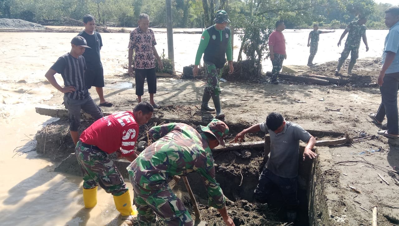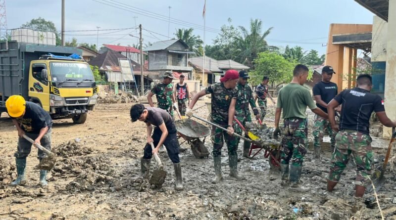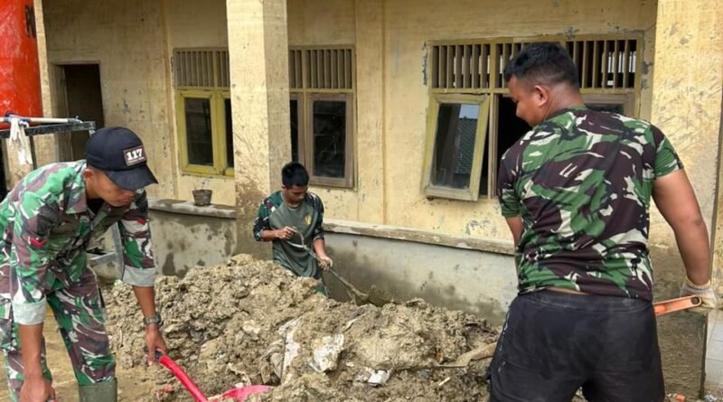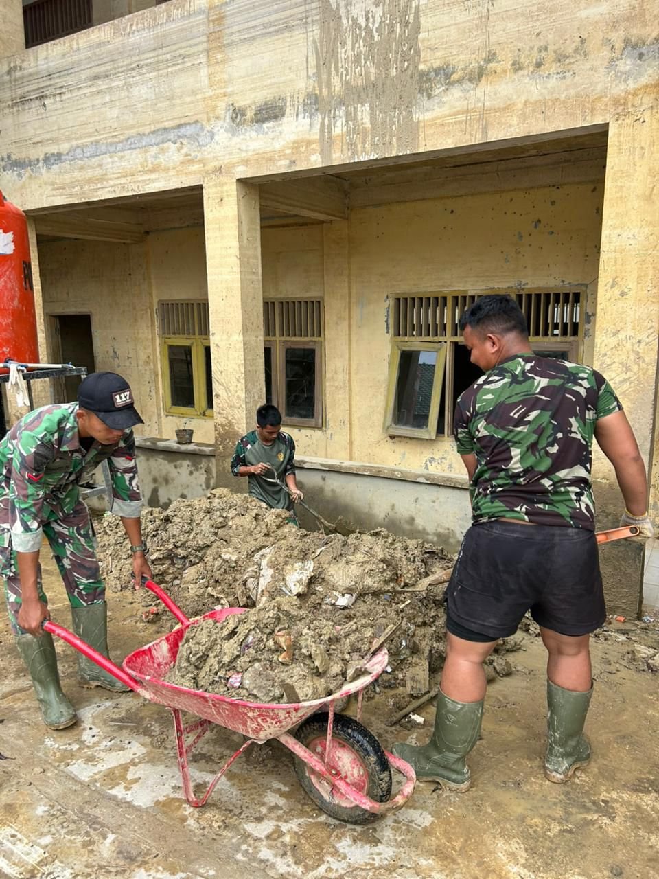 Pasca terjadinya bencana banjir, TNI bersama relawan terus bergerak cepat melaksanakan pembersihan sejumlah fasilitas umum yang terdampak. Kegiatan
