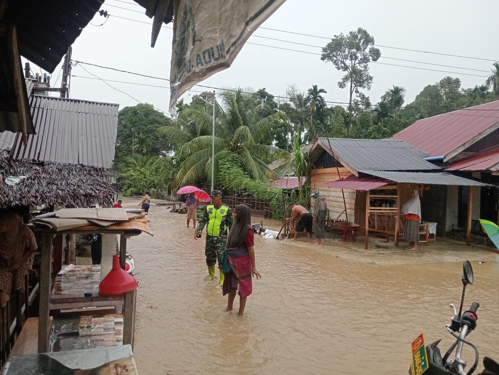 ACEH BARAT – Curah hujan tinggi yang mengguyur wilayah Pante Ceureumen dalam beberapa hari terakhir kembali memicu naiknya debit air sungai dan menyebabkan banjir di sejumlah titik rawan. Merespons kondisi tersebut, para Babinsa Posramil 05/Pante Ceureumen Kodim 0105/Aceh Barat bergerak cepat dengan melakukan pemantauan intensif sejak dini hari hingga malam, memastikan situasi tetap terkendali sekaligus meminimalkan risiko bagi masyarakat di wilayah Kecamatan Pante Ceureumen, Kamis (27/11/2025).