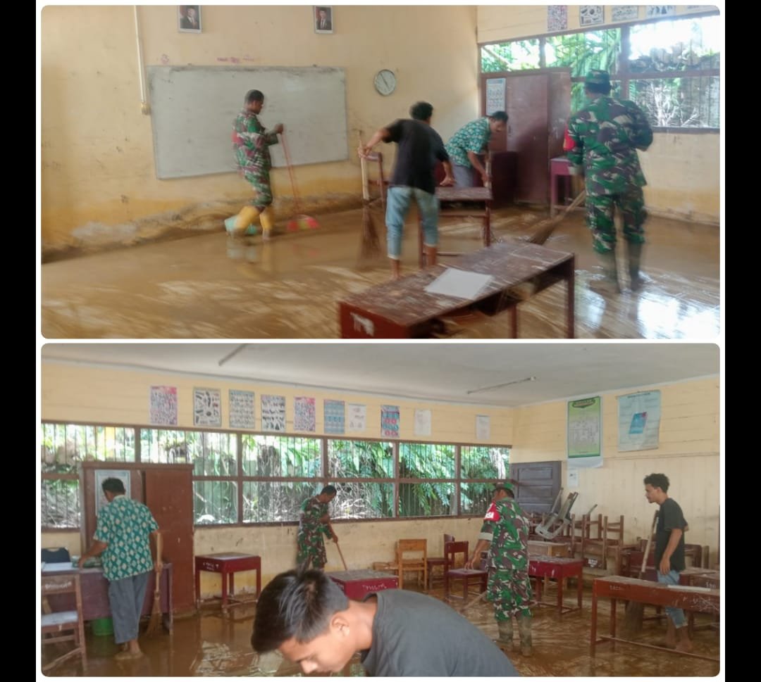 Banjir yang terjadi beberapa hari sebelumnya membawa lumpur tebal dan merusak sejumlah ruang kelas, sehingga proses belajar mengajar terhenti. Menyadari pentingnya ruang pendidikan yang aman dan layak, Babinsa bersama warga, tenaga pendidik, dan perangkat desa bergerak cepat melakukan pembersihan.