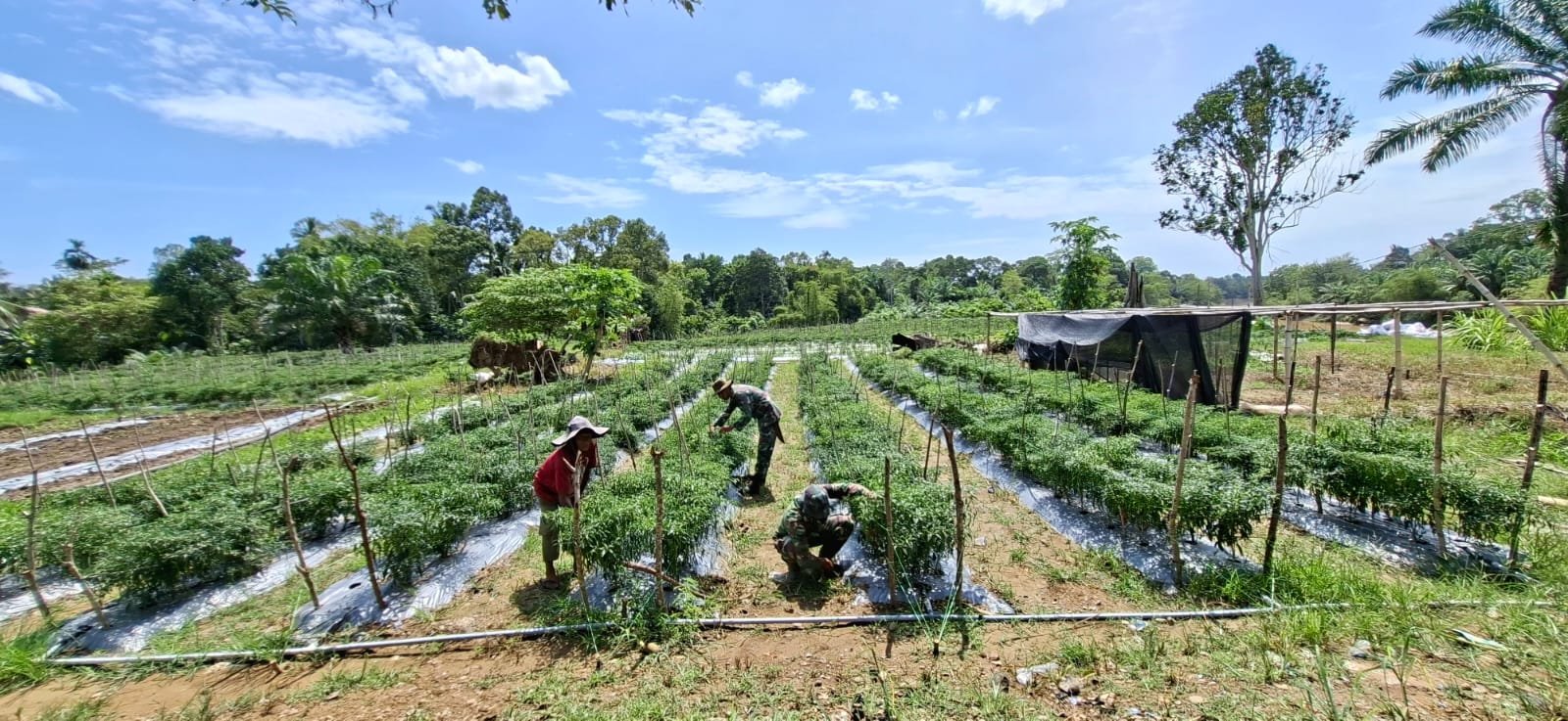 Selasa (10/3/2026), suasana kebun kembali hidup oleh aktivitas Satgas TMMD bersama masyarakat. Mereka melakukan penyiangan gulma dan pengendalian hama agar tanaman tetap tumbuh sehat hingga masa panen tiba.