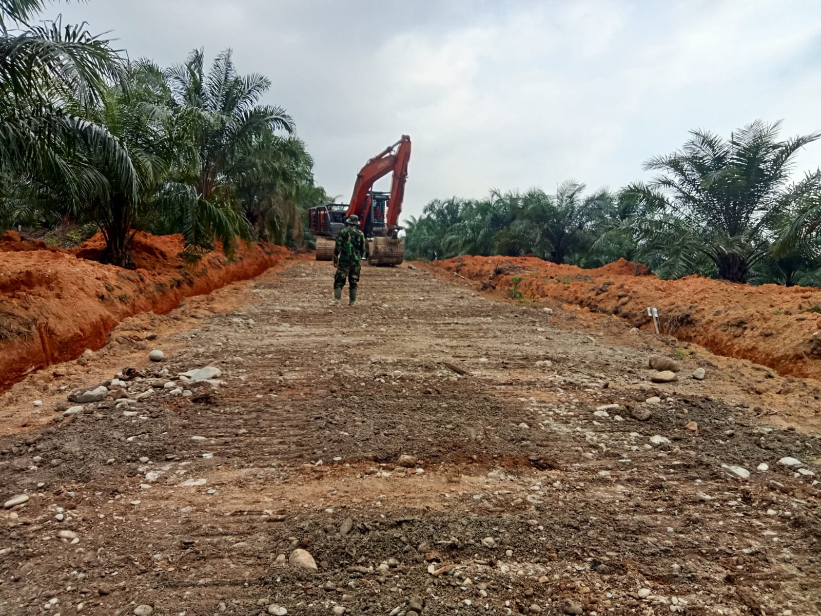 Di lokasi pembangunan, alat berat excavator terlihat meratakan timbunan tanah dan batu yang menjadi dasar badan jalan. Sementara di sejumlah titik, personel Satgas TMMD bersama masyarakat setempat merapikan permukaan jalan menggunakan cangkul dan sekop.