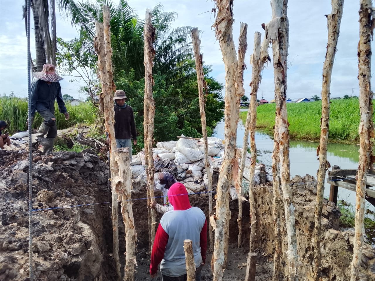 Tahapan ini merupakan bagian penting dalam proses konstruksi, mengingat kondisi tanah di wilayah tersebut yang didominasi area rawa. Penancapan galam dilakukan untuk memperkuat struktur dasar, sementara pengecoran pondasi menjadi penopang utama agar jembatan dapat berdiri kokoh dan tahan lama.