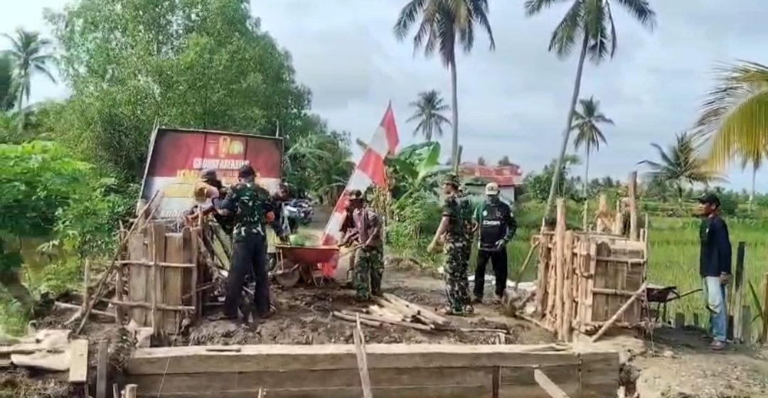‎Pada hari ini, Jumat (24/4/2026), kegiatan pembangunan memasuki tahap penting dengan dilaksanakannya proses pengecoran pondasi pagar jembatan. Pekerjaan fisik ini berjalan lancar dan penuh semangat, didukung oleh kehadiran serta keterlibatan langsung personel TNI dari jajaran Koramil setempat.