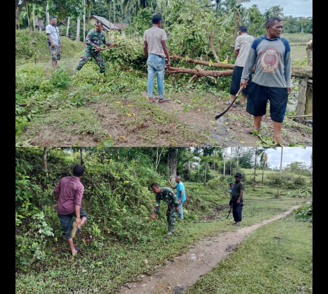 ACEH BARAT — Dalam rangka mewujudkan dan memperkuat kemanunggalan TNI dengan rakyat, Babinsa Posramil 05/Pante Ceureumen terus menunjukkan peran aktif serta kepeduliannya terhadap kondisi lingkungan dan kehidupan sosial masyarakat di wilayah binaan. Hal tersebut diwujudkan melalui kegiatan gotong royong bersama warga di Desa Seumantok, Kecamatan Pante Ceureumen, Kabupaten Aceh Barat, Minggu (28/12/2025).