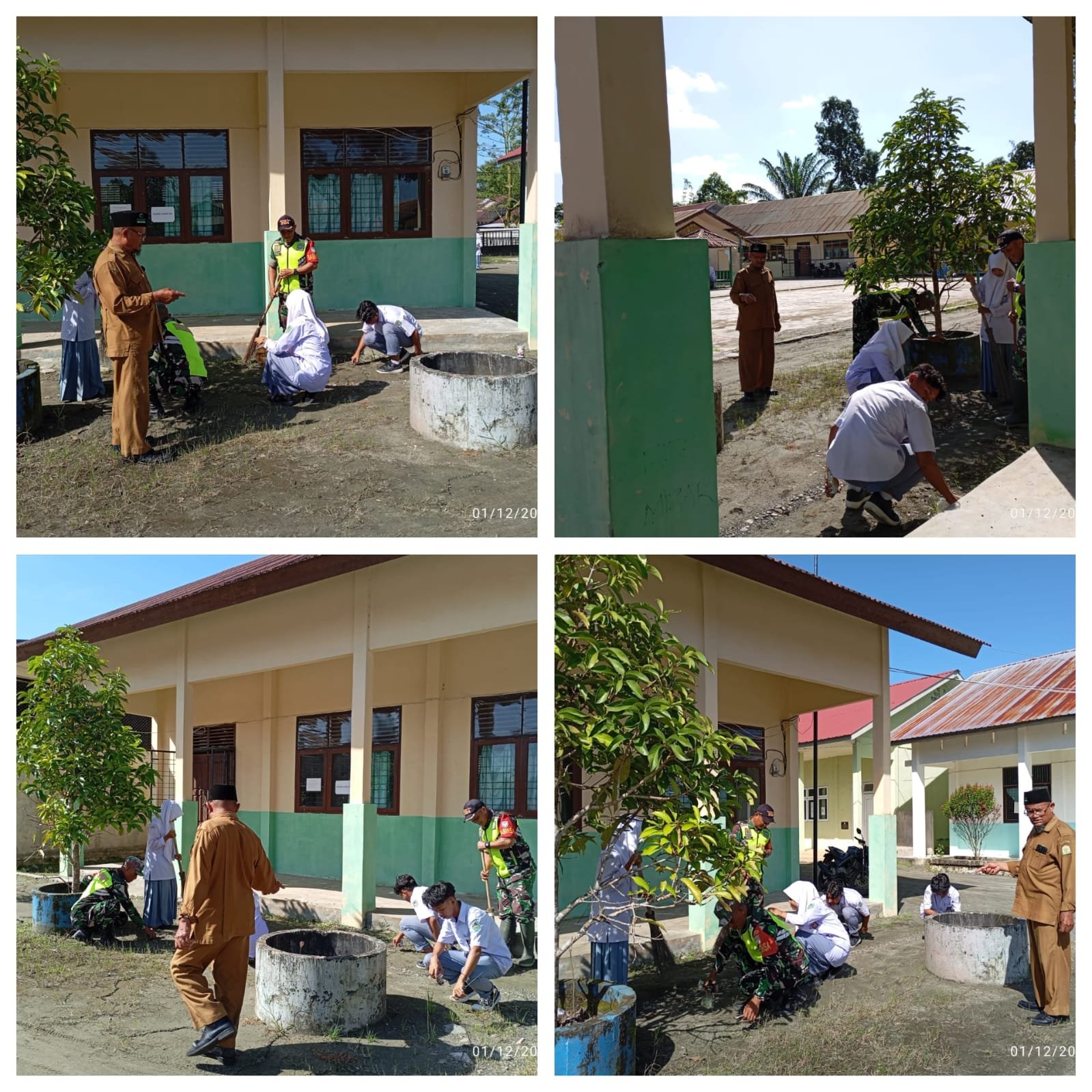 ACEH BARAT — Bintara Pembina Desa (Babinsa) Posramil 06/Bubon Kodim 0105/Aceh Barat, Sertu Pendi dan Serda Endi, bersama siswa-siswi SMA Negeri 1 Bubon melaksanakan kerja bakti membersihkan lingkungan sekolah, Senin (01/12/2025).