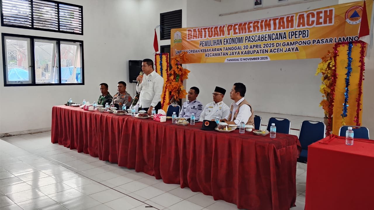 ACEH JAYA – Pemerintah Provinsi Aceh melalui Badan Penanggulangan Bencana Aceh (BPBA) menyalurkan bantuan Pemulihan Ekonomi Pasca Bencana (PEPB) bagi pedagang korban kebakaran Pasar Tradisional Lamno. Penyerahan bantuan berlangsung di Gedung Kader Desa Pasar Lamno, Kecamatan Jaya, Kabupaten Aceh Jaya, Rabu (12/11/2025).