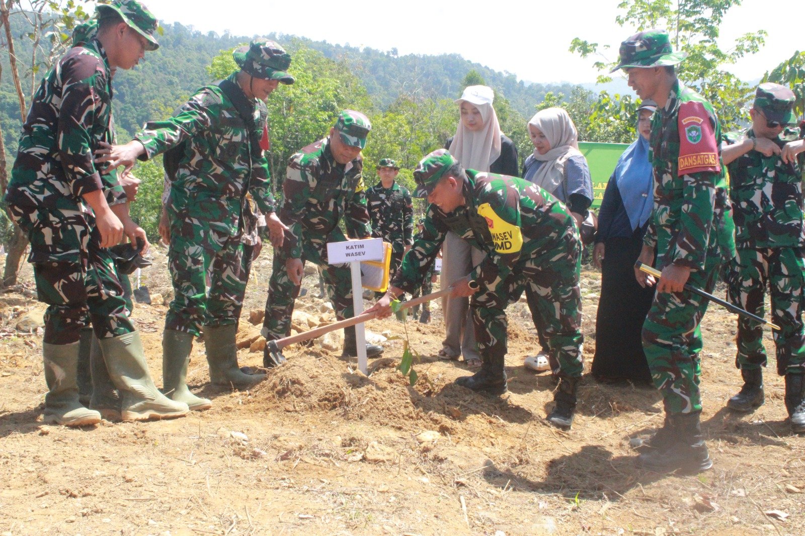 Di lokasi kegiatan, suasana kebersamaan begitu terasa. Personel TNI, warga, hingga tamu undangan saling membantu dalam proses penanaman. Tanah yang awalnya kering perlahan tertutup kembali setelah bibit pohon berdiri tegak.