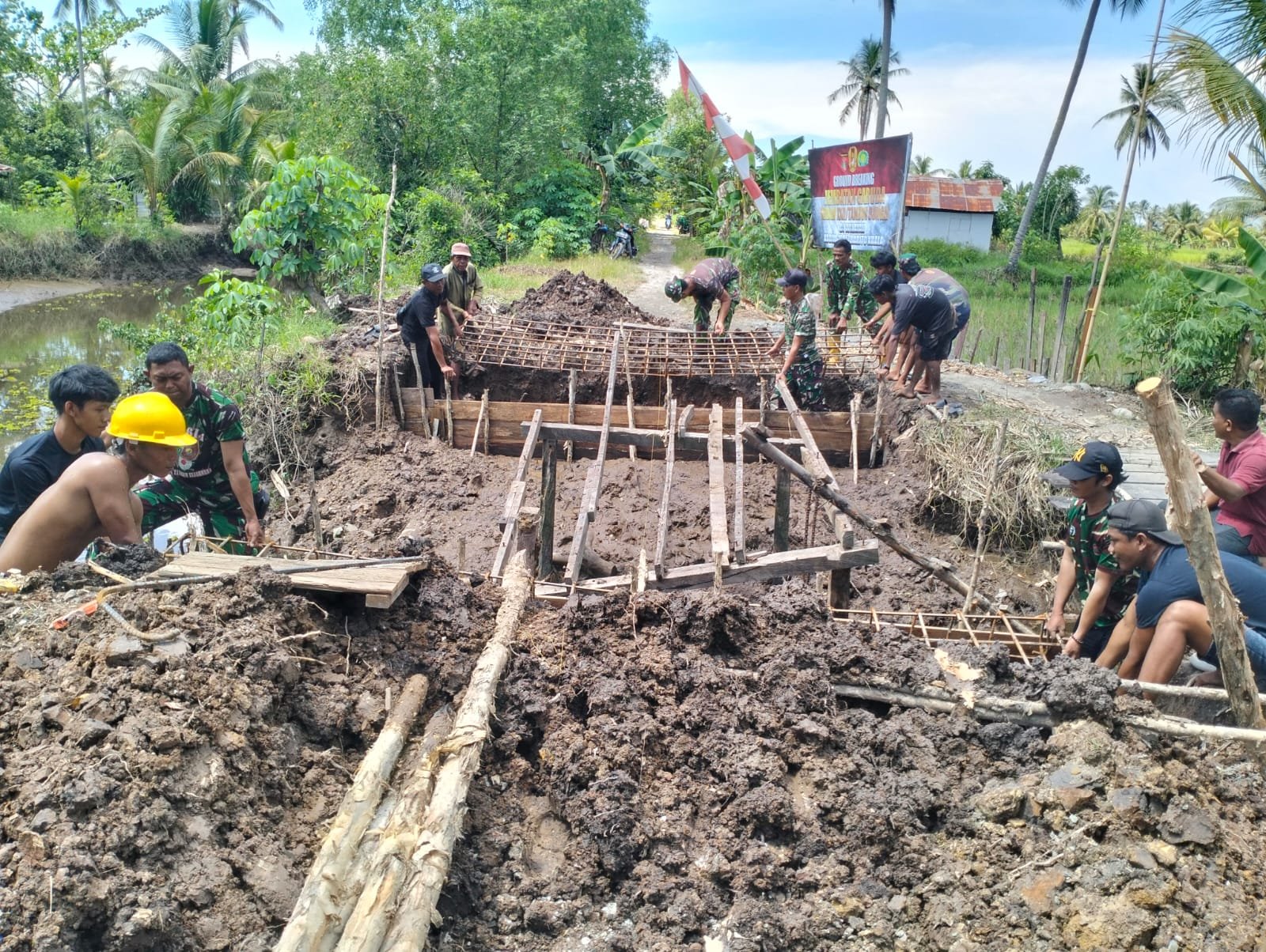 Senin (20/4/2026), suasana gotong royong begitu terasa saat warga bersama Babinsa Koramil 1005-10/Tamban, Sertu Salim, bahu membahu mengangkat besi bantalan sebagai pondasi awal jembatan. Meski harus berjibaku dengan kondisi medan yang basah dan berlumpur, semangat kebersamaan tidak pernah surut. Canda tawa dan semangat saling membantu justru menjadi energi positif yang mengiringi setiap tahapan pekerjaan.