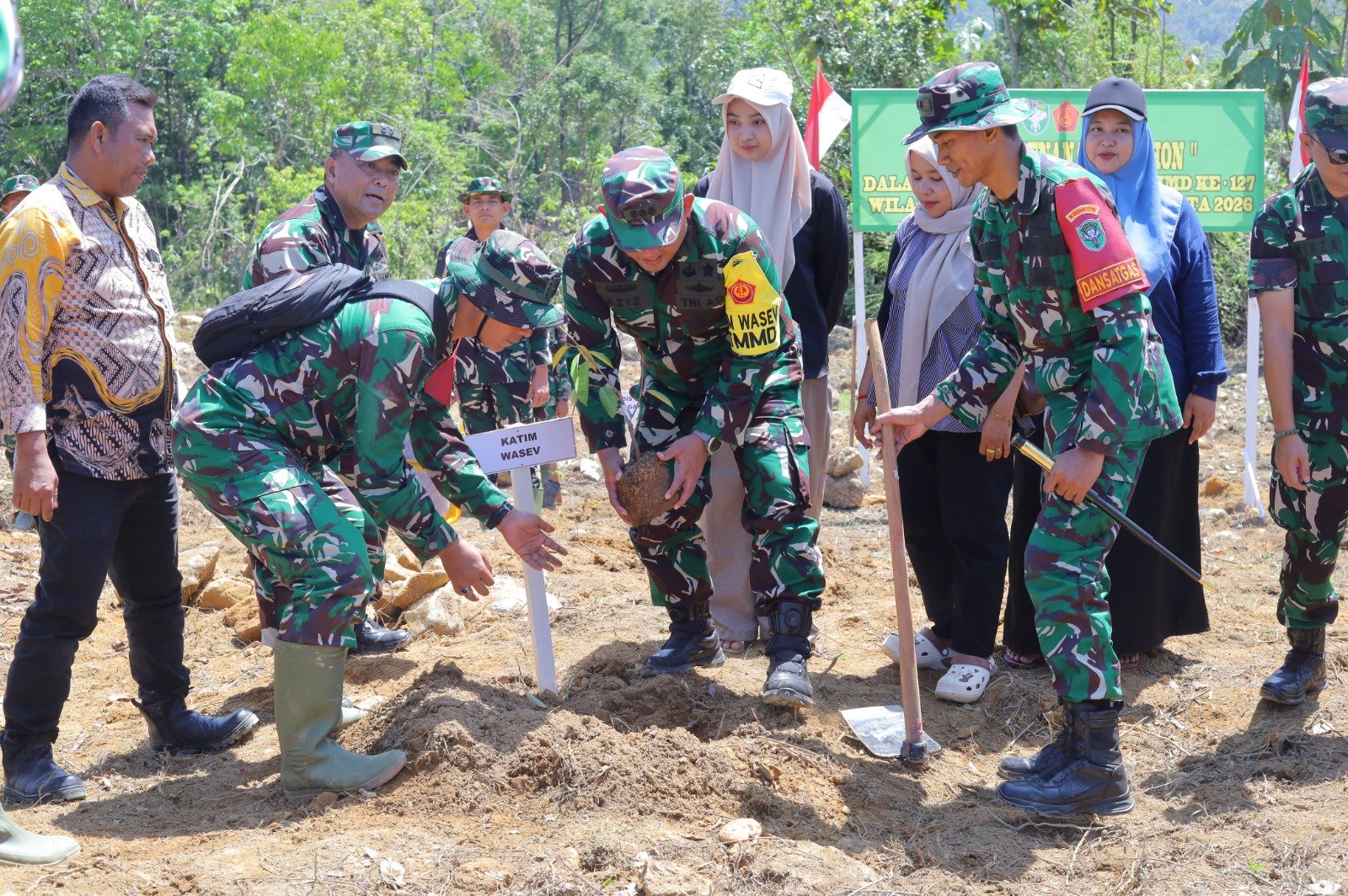 NAGAN RAYA – Suasana hangat penuh kebersamaan terlihat di lokasi pelaksanaan TMMD Ke-127 Kodim 0116/Nagan Raya, ketika sejumlah prajurit TNI bersama warga dan tamu undangan menanam bibit pohon di area kegiatan.