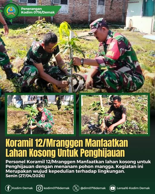 DEMAK – Kreativitas dan kegiatan selalu digalakkan oleh personel Koramil 12/Mranggen Kodim 0716/Demak dengan memanfaatkan lahan kosong di lingkup perkantorannya. Dengan inovatif, kesempatan tersebut dimanfaatkan dengan cara menanam tanaman pohon mangga. Bertempat di belakang rumah dinas Makoramil, lahan kosong dimanfaatkan untuk menanam tumbuhan yang bermanfaat, Senin (27/04/2026).