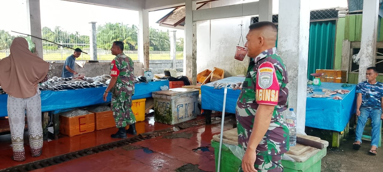 Dalam kesempatan itu, para Babinsa menyempatkan diri berdialog secara langsung dengan pedagang ikan yang sedang berjualan di area pasar. Percakapan berlangsung dengan suasana santai namun penuh keakraban.