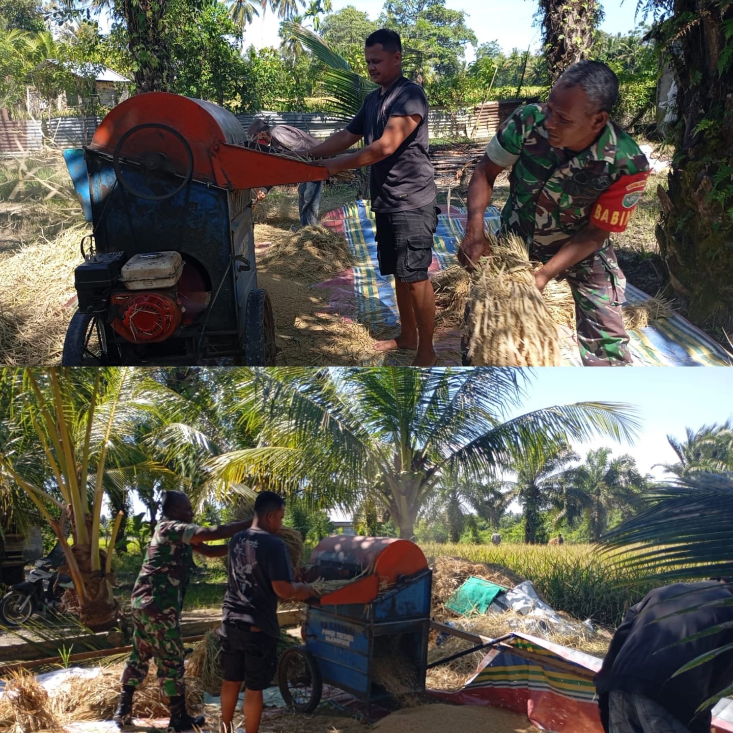 Di bawah terik matahari pagi, Serma M. Nasir bersama Pak Walis, salah seorang petani setempat, bekerja bahu-membahu merontokkan padi hasil panen. Aktivitas ini bukan sekadar rutinitas pertanian, melainkan simbol kebersamaan dan gotong royong yang masih terjaga di tengah masyarakat pedesaan. Kehadiran Babinsa di tengah petani memberikan motivasi sekaligus meringankan beban pekerjaan yang cukup berat.