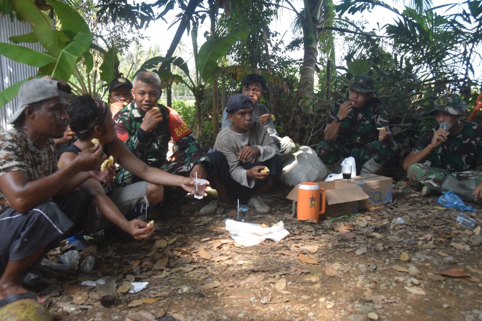 HULU SUNGAI SELATAN – Tak hanya saat bekerja melaksanakan perbaikan dan pengecoran peningkatan mutu jalan, kekompakan serta keakraban masyarakat bersama personel TNI Satuan Tugas (Satgas) TNI Manunggal Membangun Desa (TMMD) Ke-128 Kodim 1003/Hulu Sungai Selatan (HSS) sangat baik, seolah-olah tidak ada jarak sesuai dengan kalimat kemanunggalan TNI dengan rakyat dalam menyelesaikan permasalahan di kalangan masyarakat untuk mewujudkan kesejahteraan di wilayah terpencil.