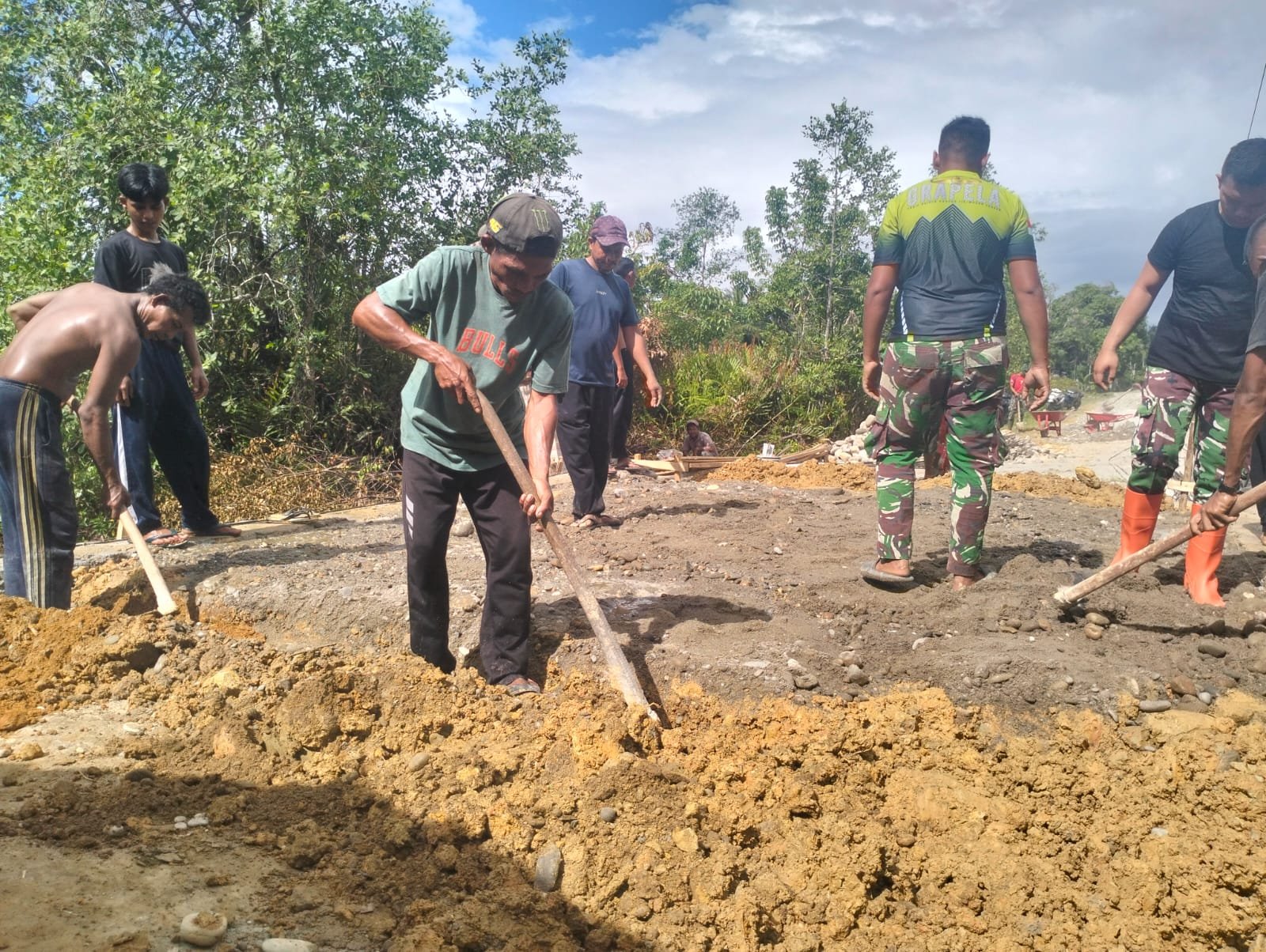 Dengan kondisi terik panas matahari, personel TNI tetap bekerja maksimal di lapangan, dibantu oleh masyarakat setempat yang turut berpartisipasi aktif dalam setiap tahapan pekerjaan. Penimbunan ini menjadi langkah penting sebelum memasuki tahap penyempurnaan konstruksi jembatan.