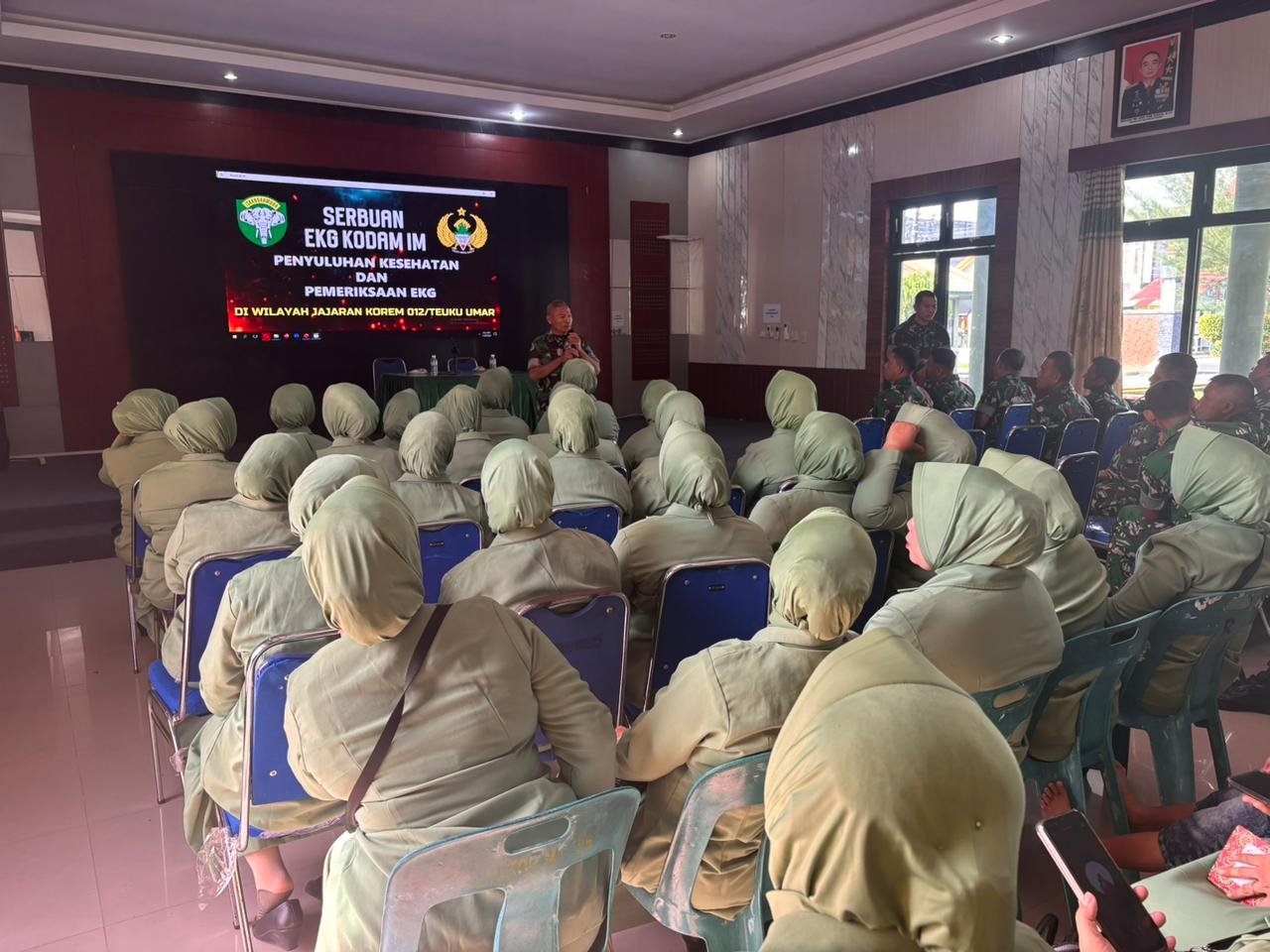 ACEH BARAT – Wujud kepedulian terhadap kesehatan jantung Prajurit dan Persit, Kodam Iskandar Muda menggelar kegiatan Serbuan Elektrokardiogram (EKG) berupa penyuluhan kesehatan dan pemeriksaan EKG di Aula Makodim 0105/Abar, Jalan Imam Bonjol, Desa Drien Rampak, Kecamatan Johan Pahlawan, Selasa (28/4/2026).