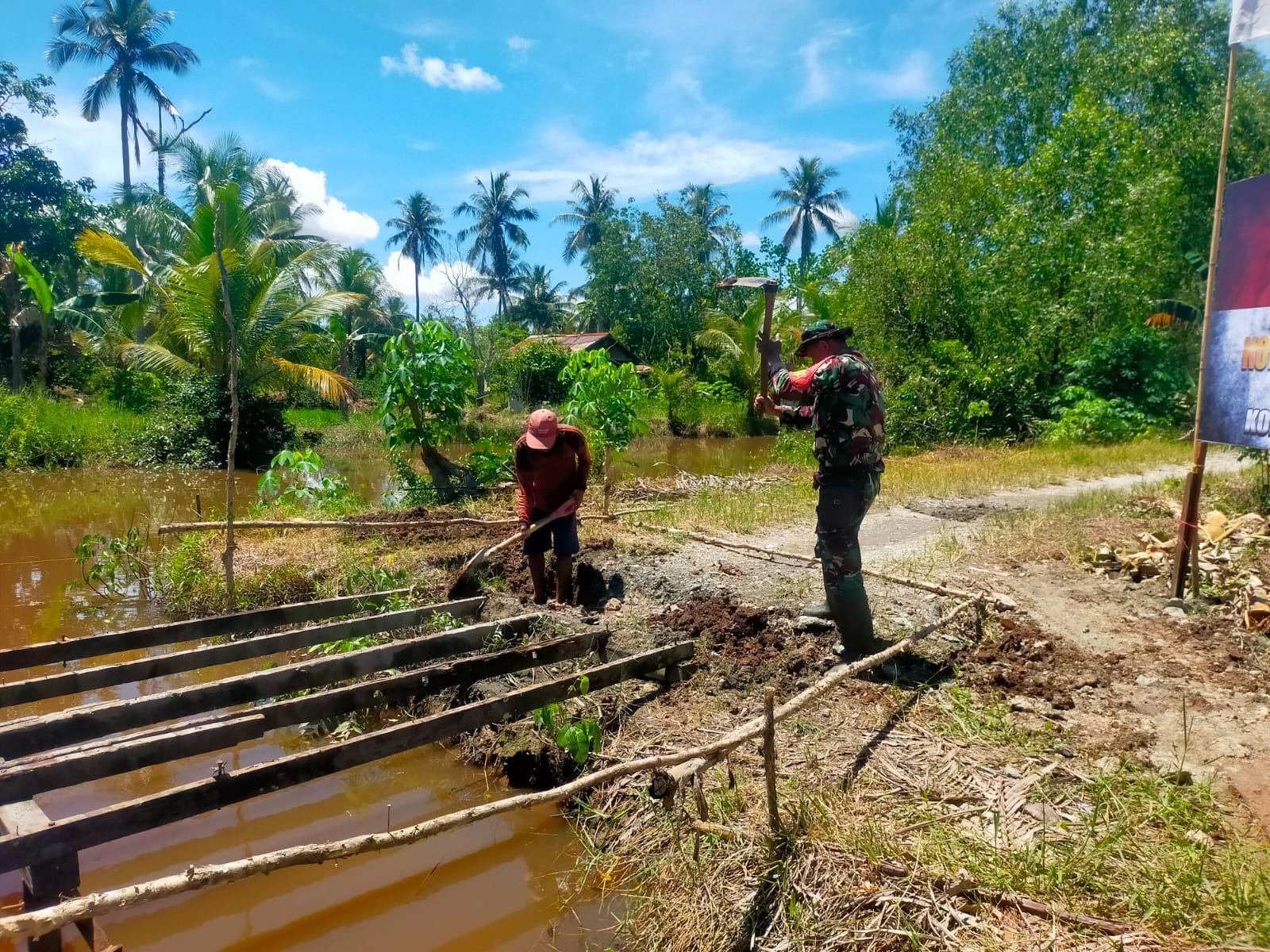 ‎”Alhamdulillah, hari ini kita masuk ke tahap penggalian lubang pondasi jembatan. Ini adalah tahap yang sangat vital karena menentukan kekokohan bangunan nantinya. Kami memastikan setiap proses dilakukan sesuai standar teknis agar hasilnya maksimal dan aman,” ujar Kapten Inf Samsudin Nor.