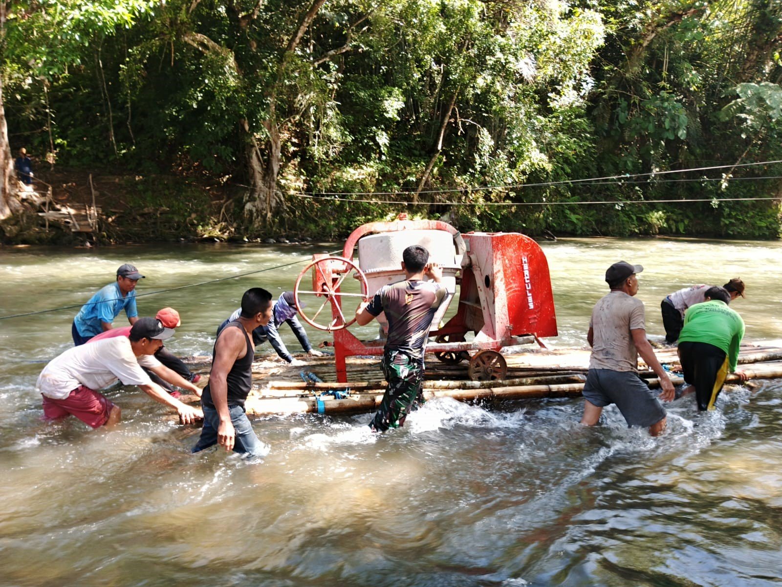 Kapten Inf Jupardi Sinurad yang berada di lokasi menjelaskan bahwa molen harus dibawa ke sisi seberang sungai untuk pengecoran pondasi jembatan.