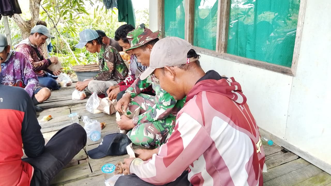 BARITO KUALA – Suasana kebersamaan terlihat di lokasi pelaksanaan TMMD Ke-126 Kodim 1005/Barito Kuala di Desa Tumih, Kecamatan Wanaraya. Saat waktu istirahat siang tiba, anggota Satgas TMMD bersama warga tampak duduk melingkar di teras rumah warga, menikmati makan siang sederhana bersama, Sabtu (01/11).