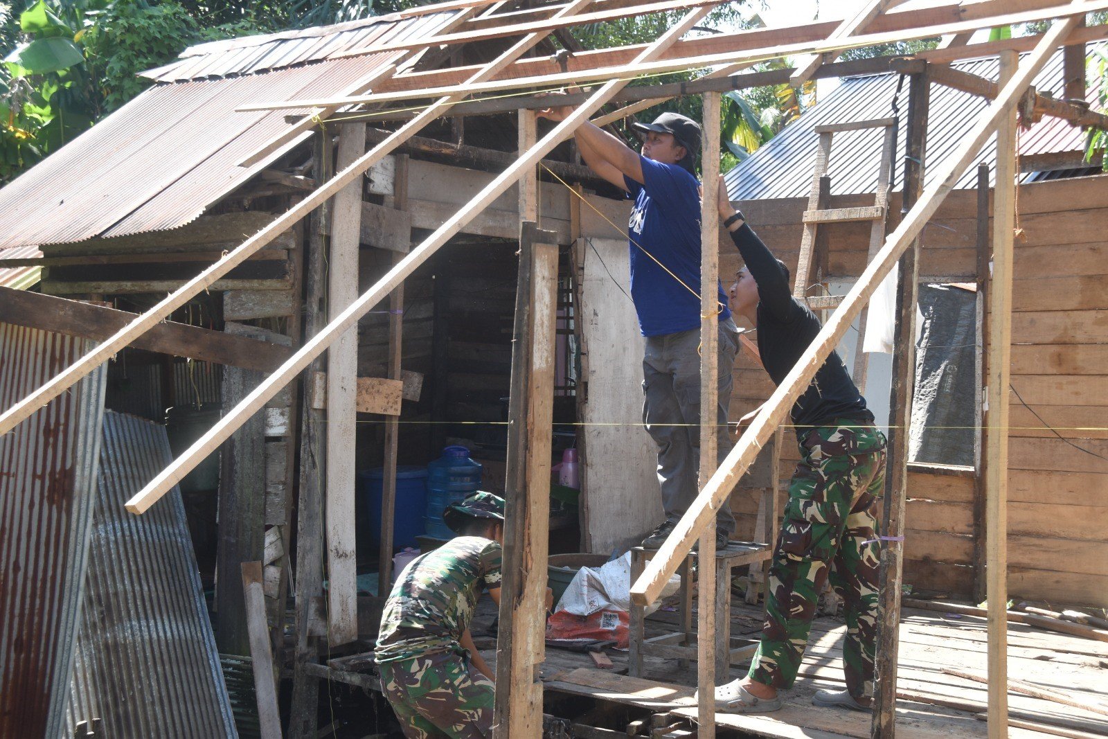 HULU SUNGAI SELATAN – Harapan Bapak Syaifullah (56), warga Desa Pantai Ulin, Kecamatan Simpur, Kabupaten Hulu Sungai Selatan (HSS), untuk memiliki rumah yang layak huni dan memenuhi standar kesehatan akhirnya terwujud. Rumah kayu berukuran 6×5 meter miliknya yang selama ini rapuh, keropos, dan selalu bocor saat hujan, kini tengah direhab total oleh Satuan Tugas (Satgas) TNI Manunggal Membangun Desa (TMMD) Reguler ke 128 Kodim 1003/HSS. Sabtu (25/4/26)