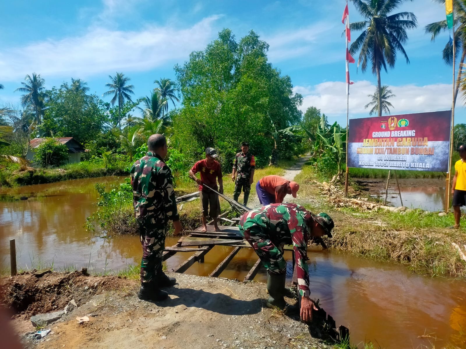 ”Pembangunan Jembatan Garuda ini kami laksanakan sebagai wujud kepedulian dan pengabdian TNI kepada masyarakat. Kami melihat betapa pentingnya jembatan ini bagi warga Tamban Bangun untuk aktivitas sehari-hari, terutama dalam mengangkut hasil bumi dan keperluan lainnya. Oleh karena itu, kami bergerak cepat untuk memulai tahap pembongkaran sebelum dilanjutkan dengan pembangunan struktur yang baru dan lebih kokoh,” ujar Kapten Inf Samsudin Nor.