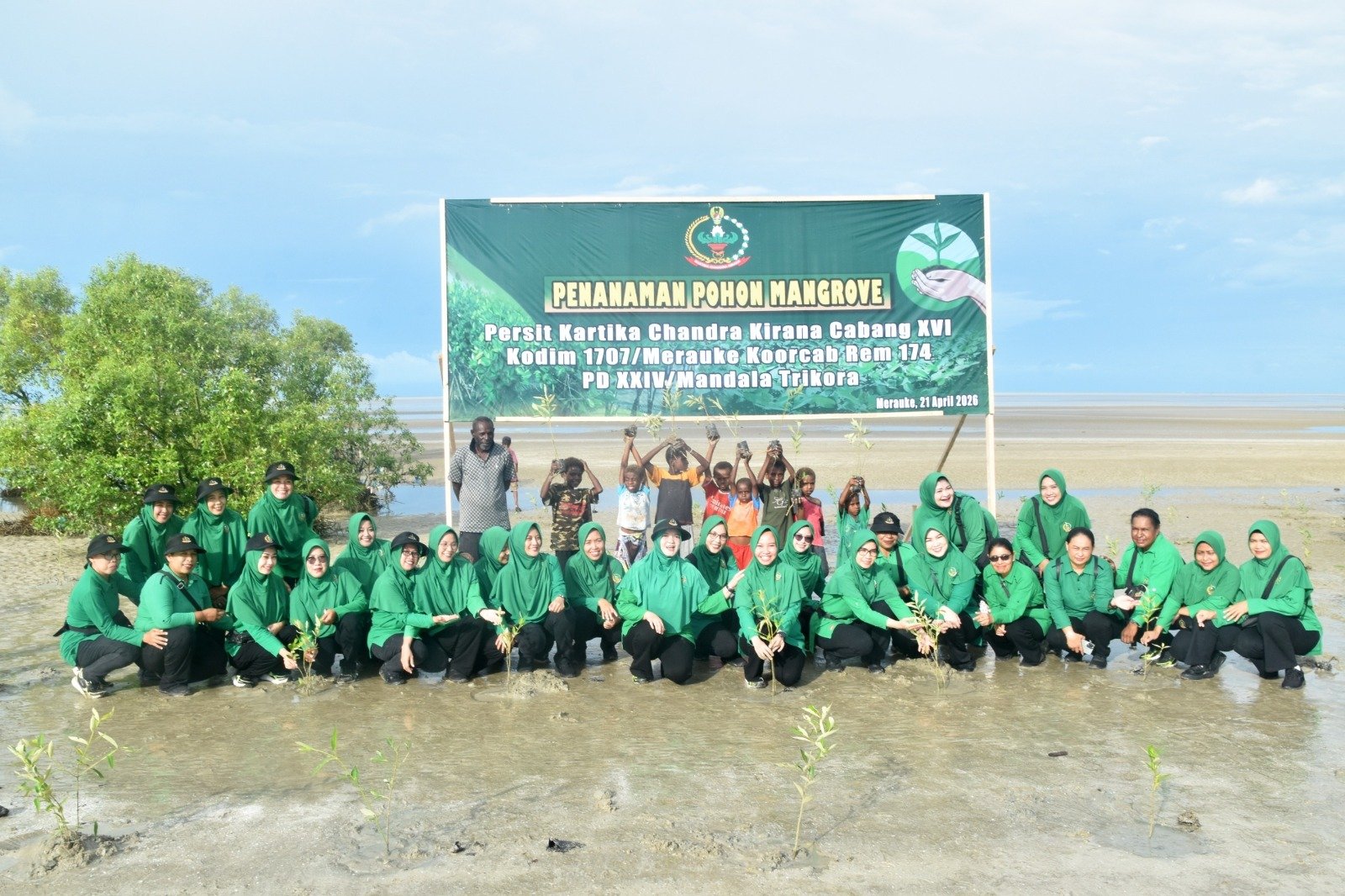 MERAUKE – Aksi nyata kepedulian terhadap lingkungan kembali ditunjukkan oleh Persit Kartika Chandra Kirana Cabang XVI Kodim 1707/Merauke Koorcab Rem 174 PD XXIV/Mandala Trikora melalui kegiatan penanaman pohon mangrove yang berlangsung di Pantai Payum, Kelurahan Samkai, Distrik Merauke, Kabupaten Merauke, Provinsi Papua Selatan, pada Selasa pagi (21/04/2026). Kegiatan dipimpin langsung oleh Ketua Persit Ny. Asti Dili Eko Setyawan didampingi Dandim 1707/Merauke Letkol Czi Dili Eko Setyawan, S.Ak., M.Han.