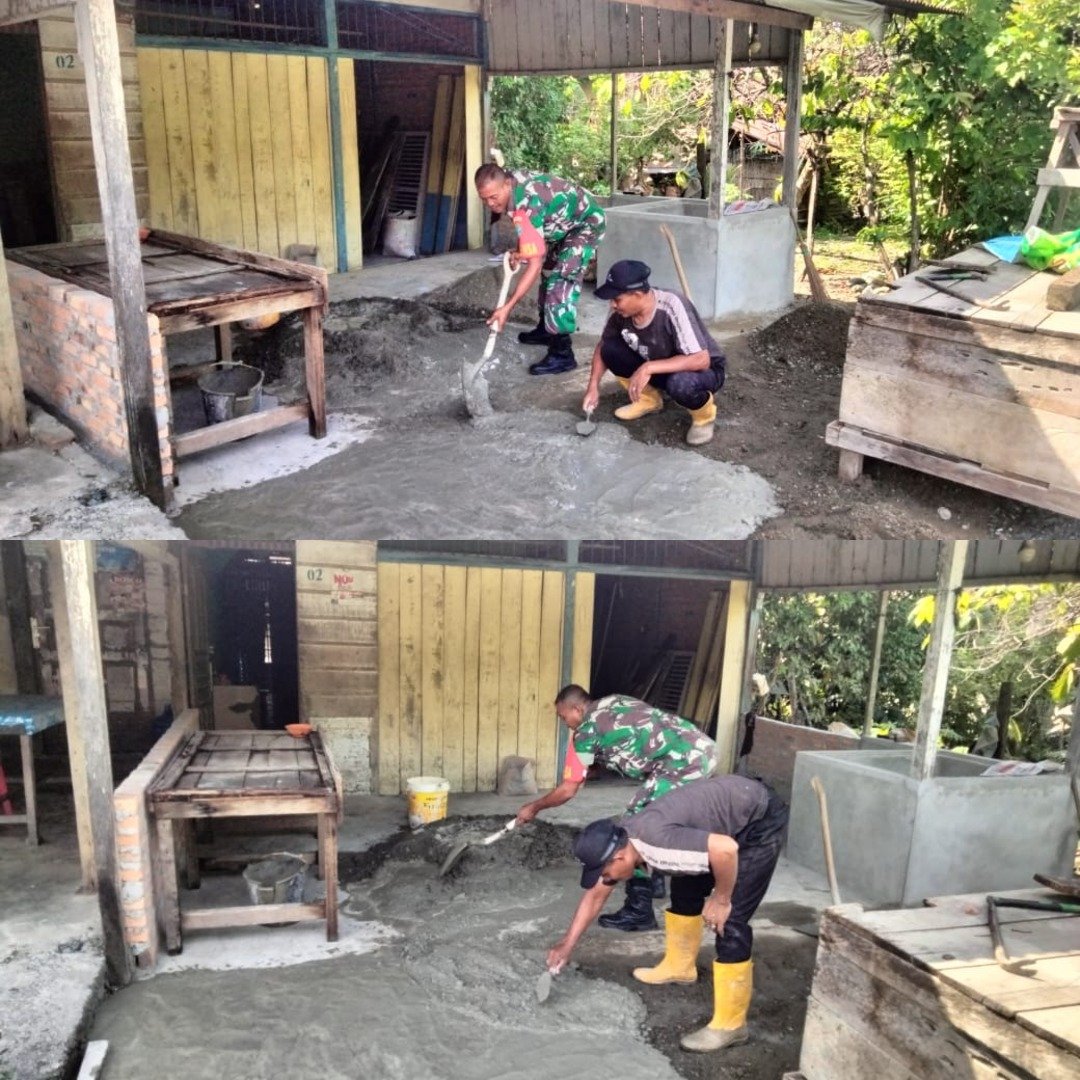 Kegiatan tersebut merupakan wujud kemanunggalan TNI dengan rakyat sekaligus mempererat hubungan silaturahmi antara aparat kewilayahan dan masyarakat. Dengan penuh semangat, Serka Amiruddin bersama warga setempat bergotong royong mengaduk semen, menyusun batu bata, hingga merapikan lantai teras rumah.