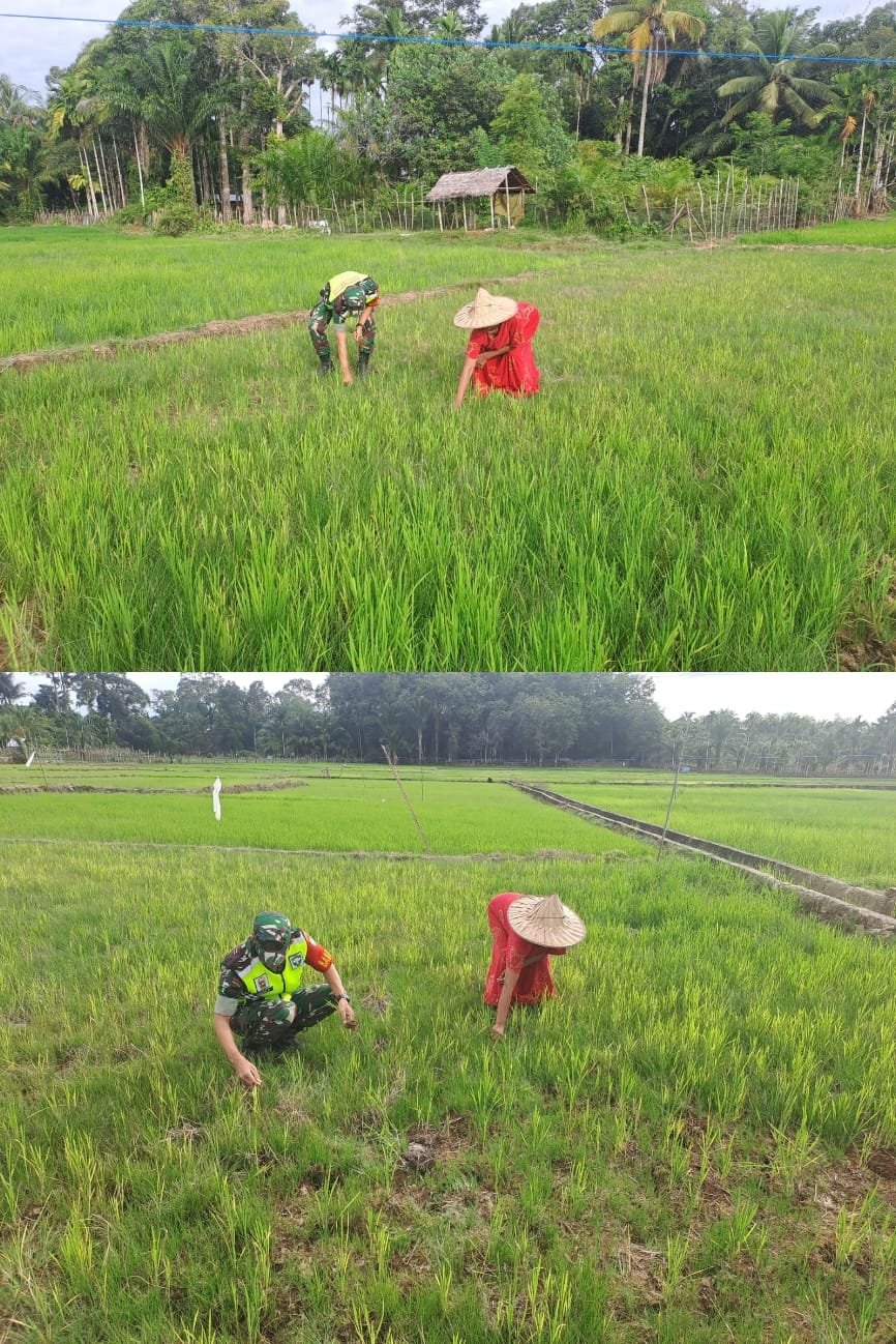 ACEH BARAT – Dalam rangka mendukung ketahanan pangan nasional, Babinsa Koramil 11/WT, Sertu Iwan, melaksanakan pendampingan kepada petani dengan membantu membersihkan rumput liar di sela-sela tanaman padi di wilayah binaannya, Desa Tangkeh, Kecamatan Woyla Timur, Senin (19/01/2026).