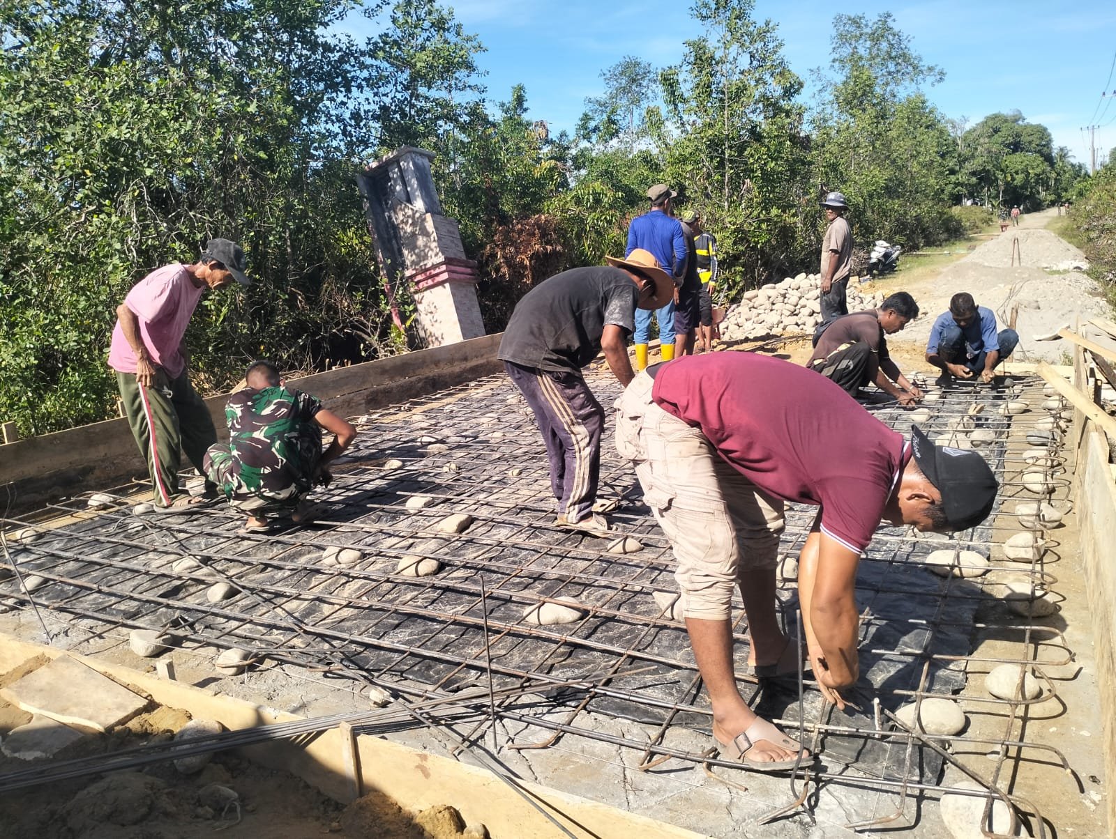 Pemasangan rangka pengecoran ini merupakan tahapan krusial guna memastikan kekuatan dan ketahanan jembatan saat difungsikan nantinya. Meski di bawah terik matahari, proses pekerjaan tetap berlangsung dengan penuh semangat dan kebersamaan.