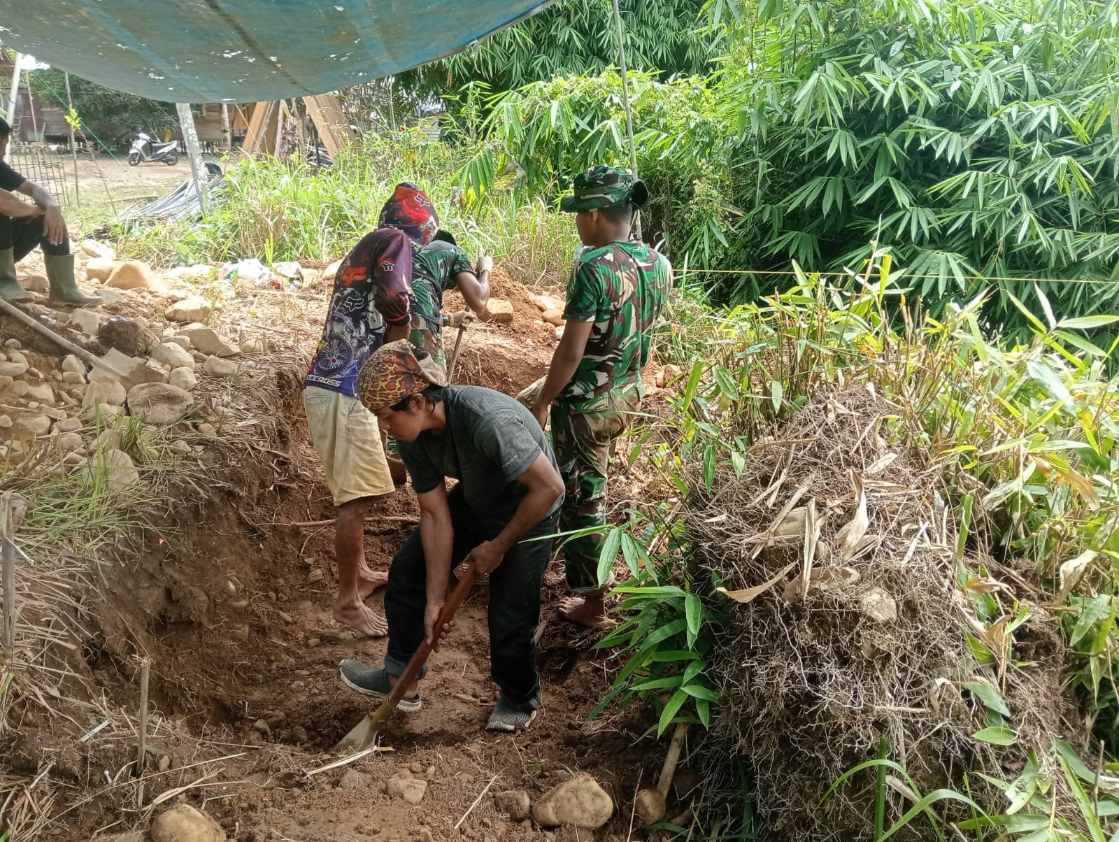Suasana kebersamaan begitu terasa di lokasi pengerjaan. TNI dan warga bahu-membahu menyelesaikan penggalian dengan penuh semangat, menjadikan gotong royong sebagai kekuatan utama untuk mempercepat penyelesaian jembatan.