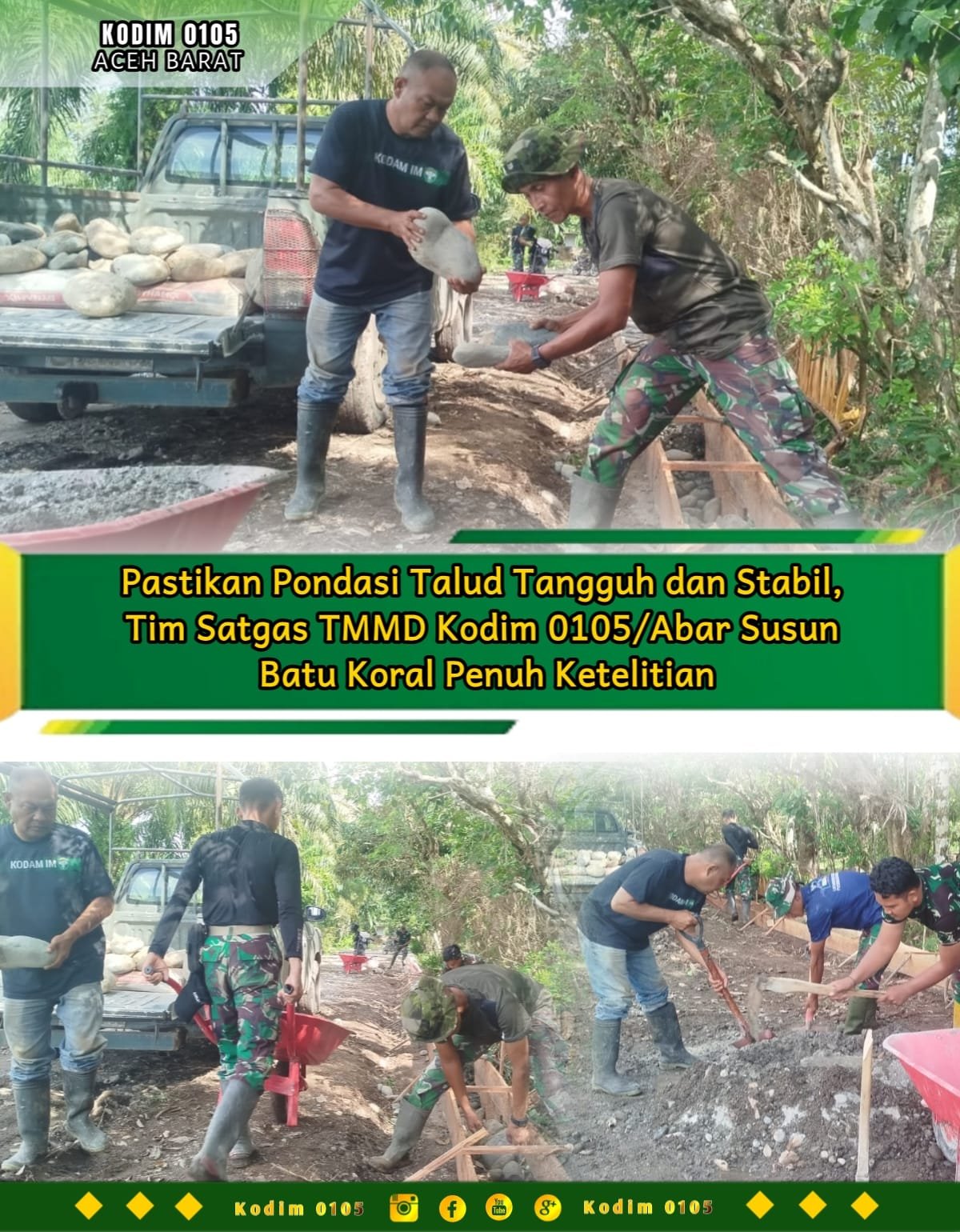 Melalui penyusunan batu koral secara teliti sebagai dasar Talud Penahan Timbunan di Desa Pasi Aceh, Kecamatan Woyla, Satgas TMMD berupaya menghadirkan konstruksi yang kokoh dan tahan lama.