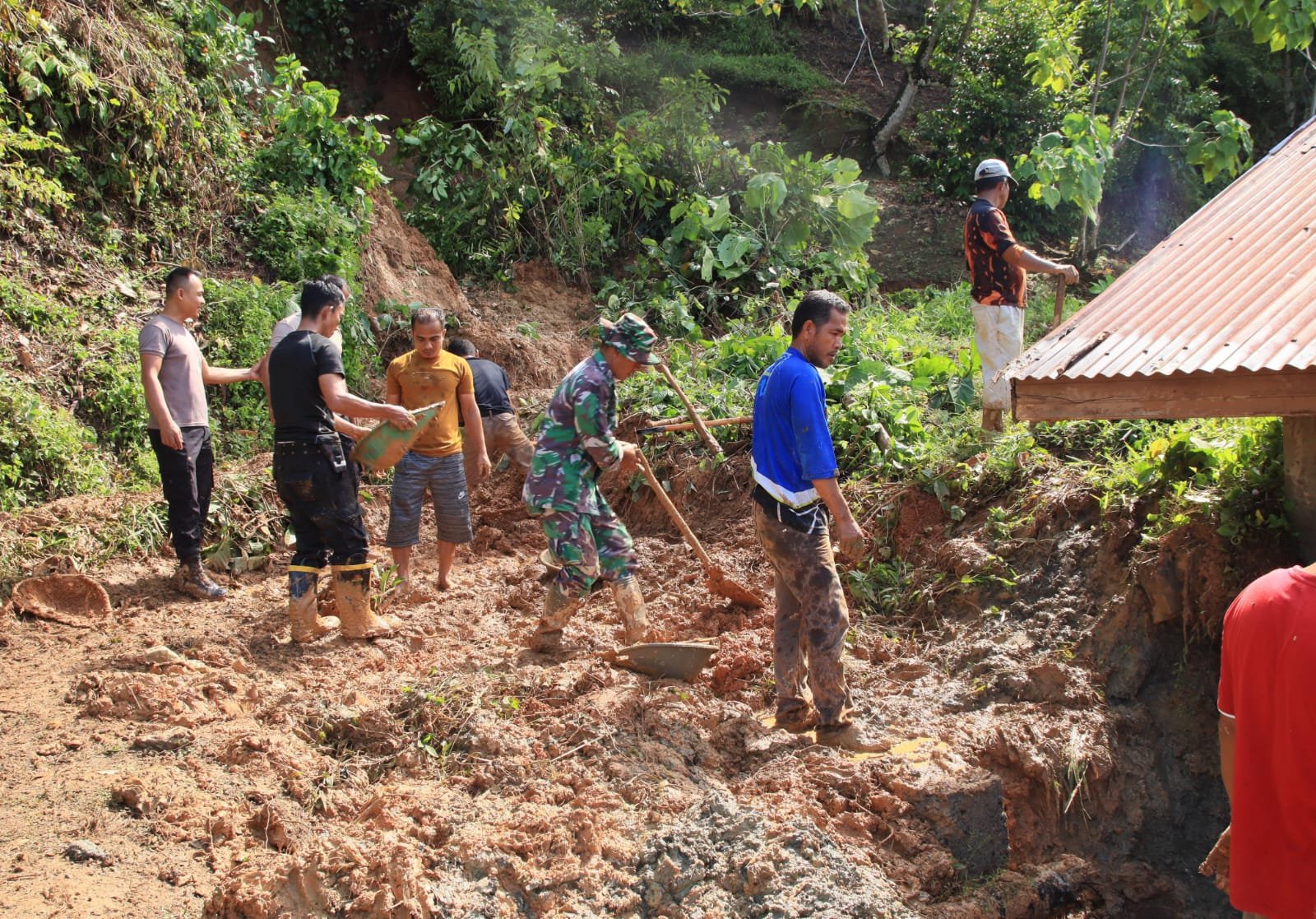 Dengan penuh semangat kebersamaan, cangkul demi cangkul menghantam tanah basah yang berat dan lengket. Di tengah kondisi tanah yang labil, proses pembersihan tetap dilakukan dengan penuh kehati-hatian.