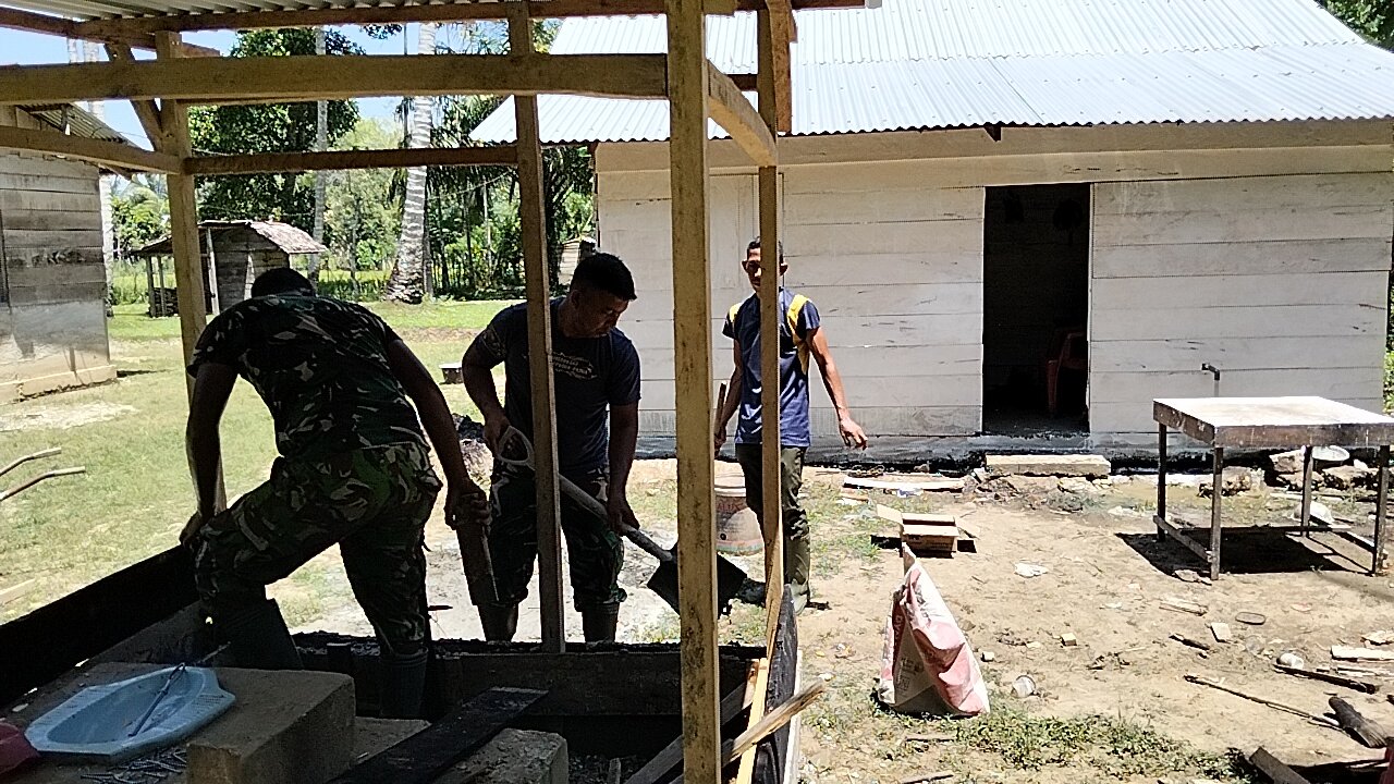Pekerjaan pembangunan dilakukan bersama-sama. Personel Satgas TMMD dan warga desa bergotong royong mencampur semen, mengangkat batu, hingga merapikan dinding jamban.
