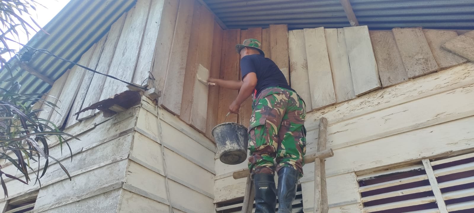 Beberapa personel Satgas TMMD terlihat melakukan penyelesaian akhir pada pekerjaan rehab rumah dengan melakukan pengecatan dan perapian bangunan.