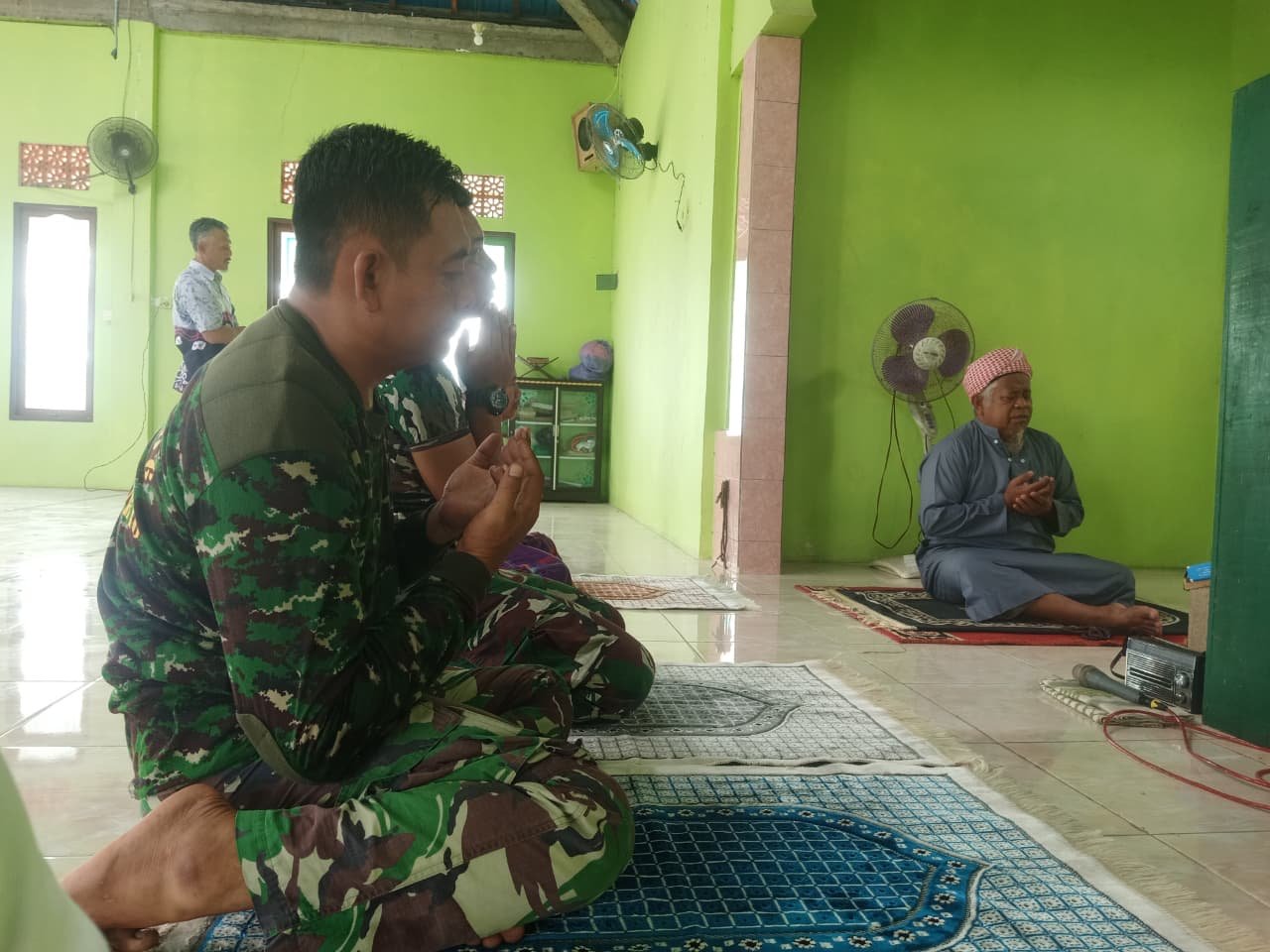 Usai shalat, suasana penuh keakraban tampak di halaman langgar. Prajurit dan warga saling bertukar cerita, menambah rasa kekeluargaan di antara mereka.
